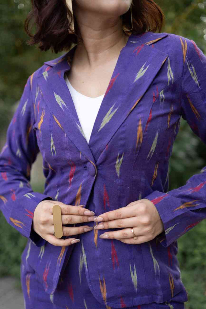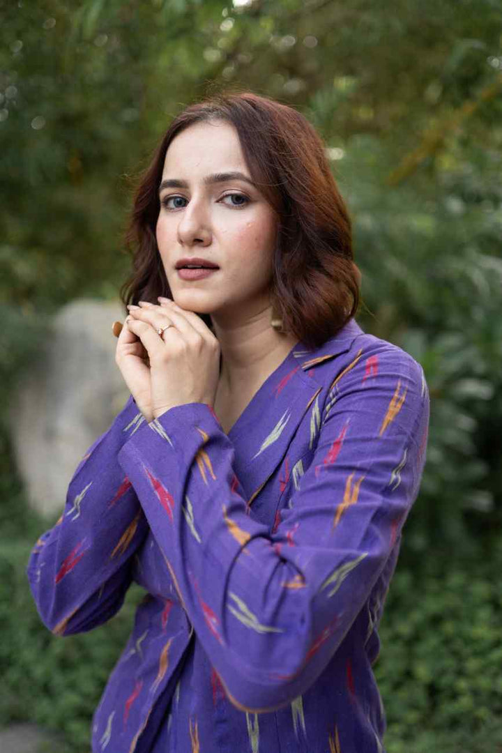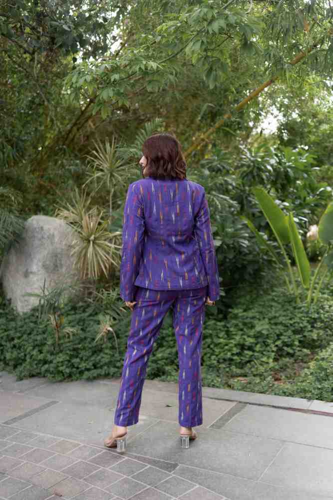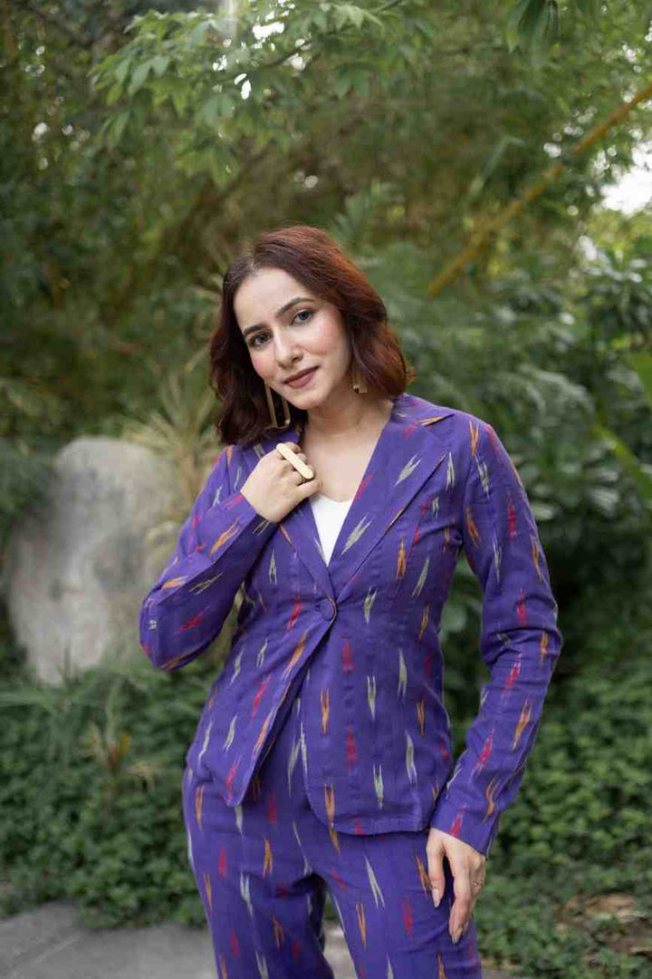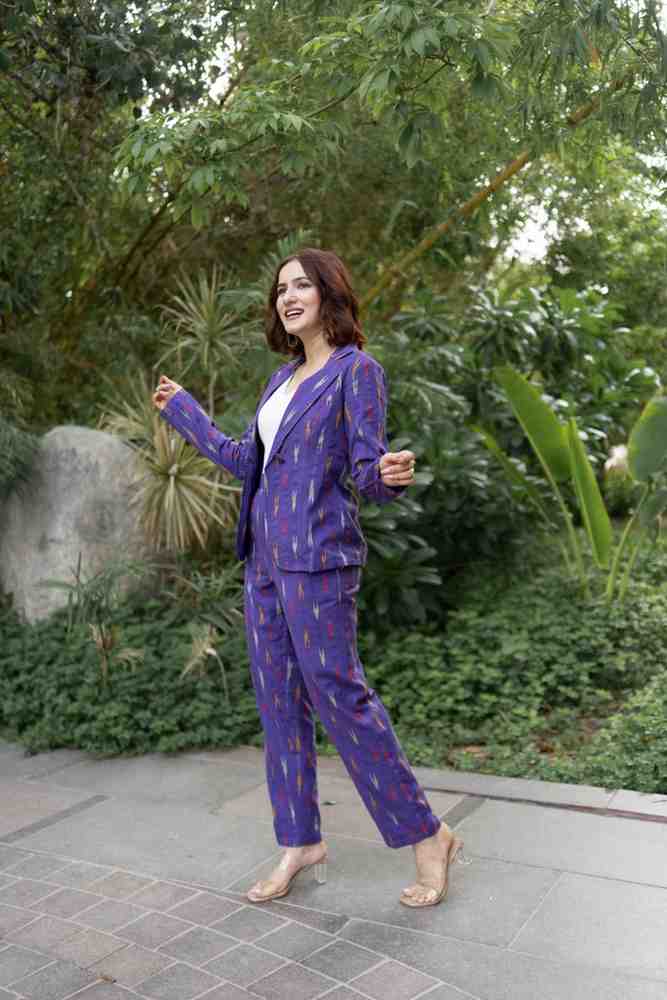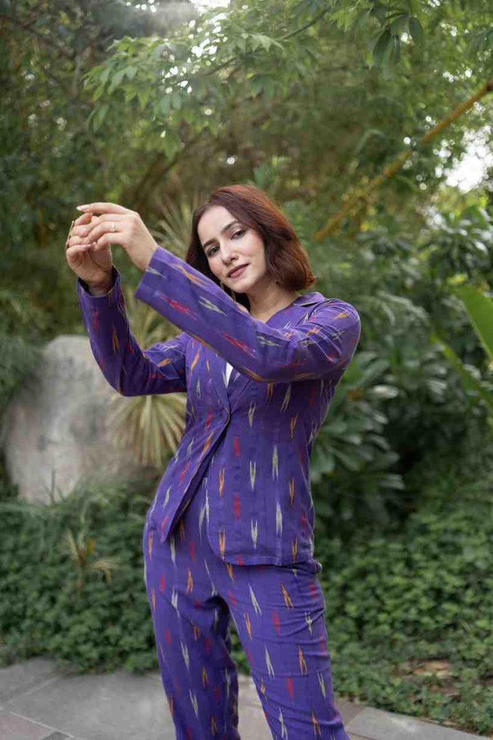 This vibrant purple co-ord set features a multicolored pattern, consisting of matching pants and a stylish blazer. The bold color and stylish design make for a chic and sophisticated look, perfect for making a statement. The blazer adds a professional touch to the outfit, while the accents of red and yellow add a pop of color, creating an elegant and polished ensemble. (Camisole is not the part of this dress)