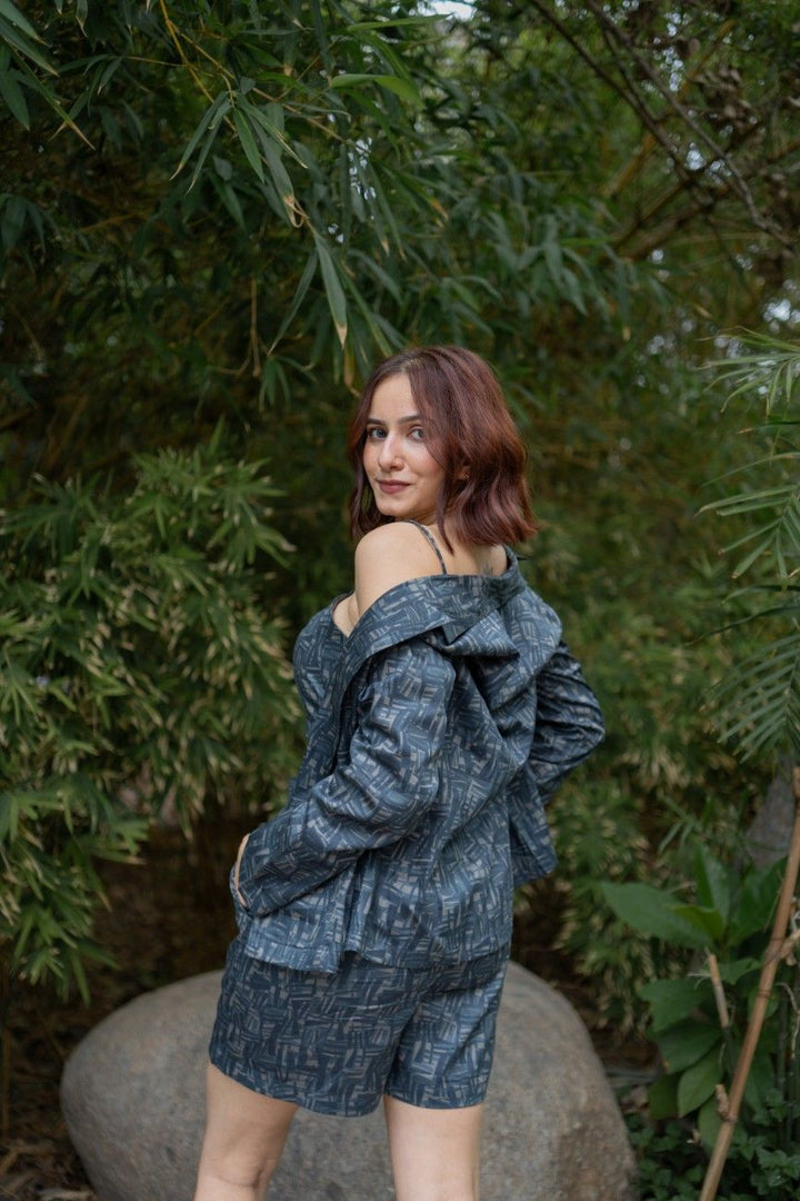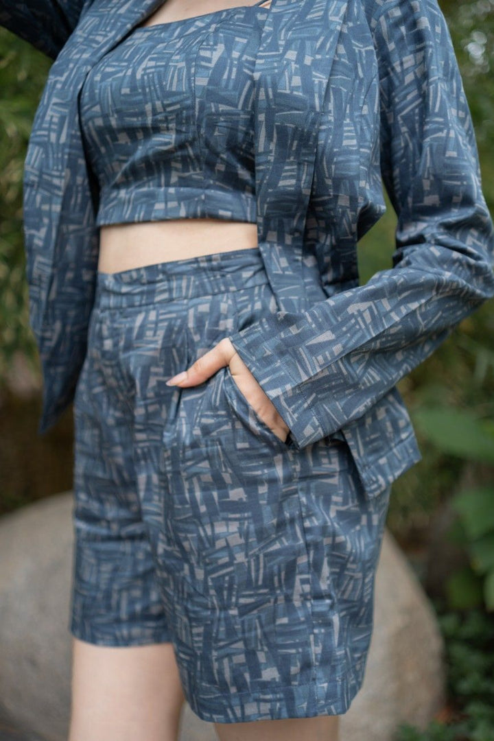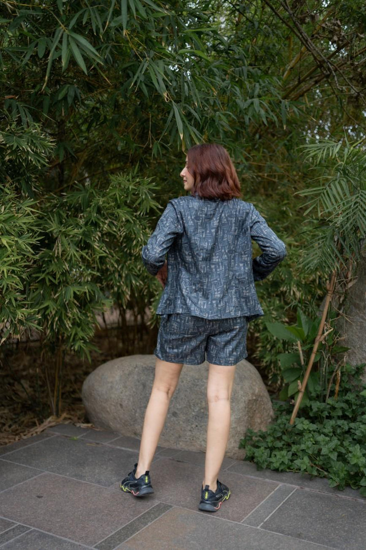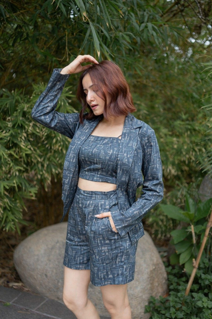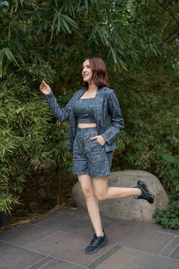 The 3-piece outfit is a stylish and modern ensemble. The gray tweed fabric gives the outfit a sophisticated and textured look. The cropped top adds a touch of femininity, while the matching shorts provide a comfortable and practical element to the outfit. The tweed blazer completes the look, adding a polished and put-together touch. The combination of these three pieces creates a chic and versatile outfit that can be dressed up or down.