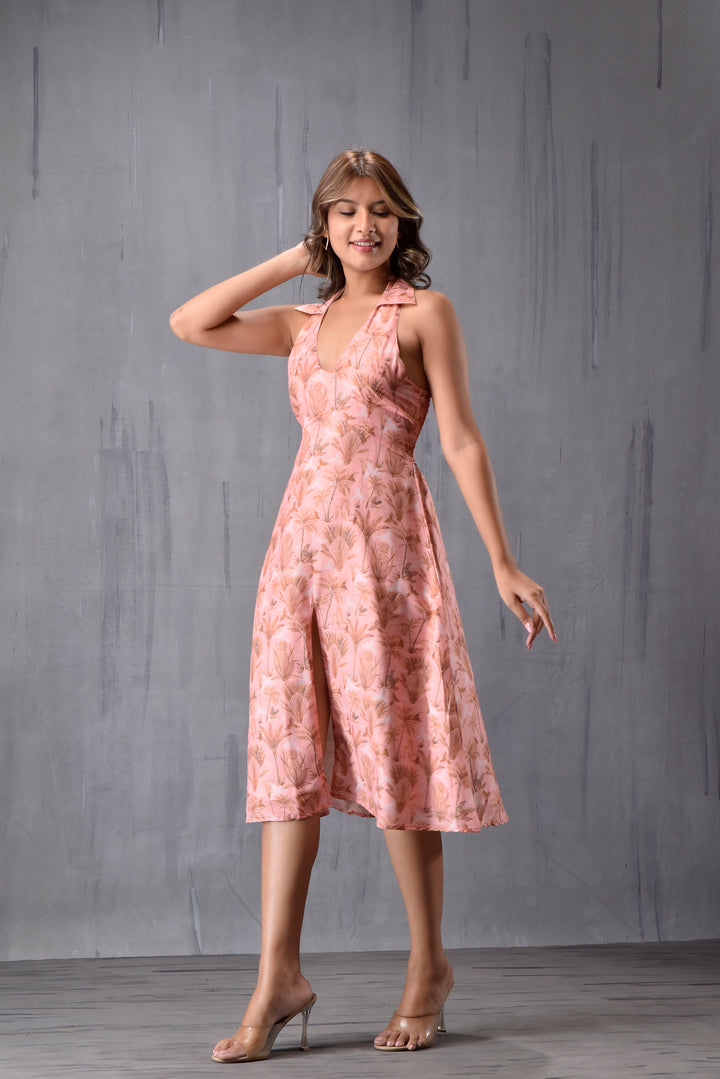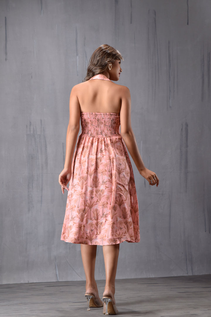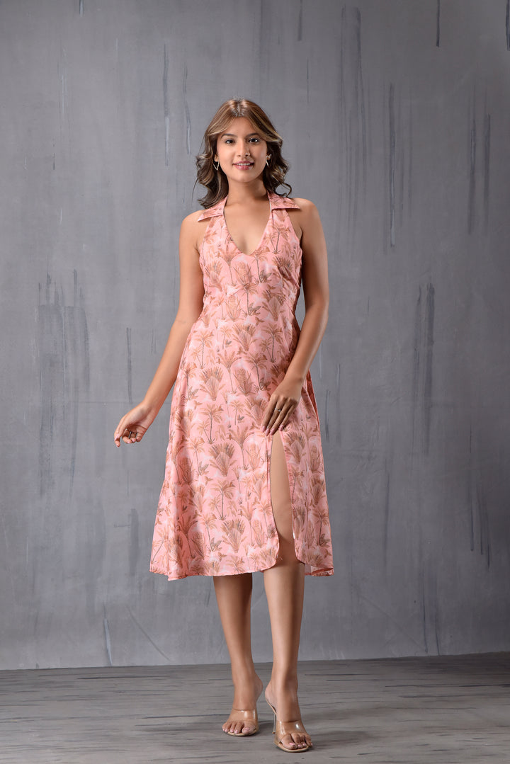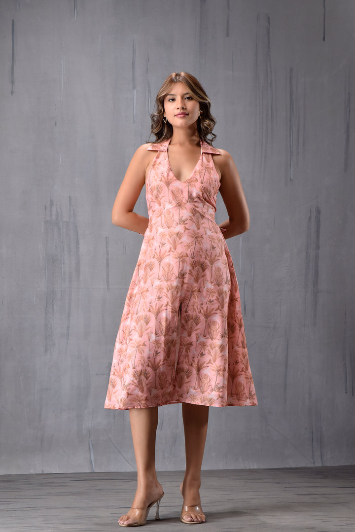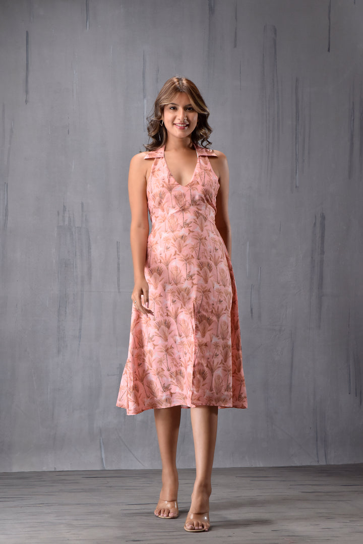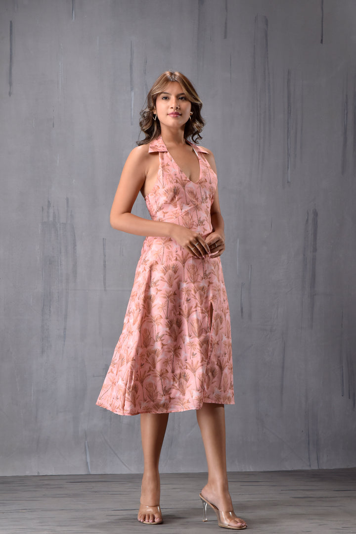 This halter-neck dress comes in a soft pink shade with delicate botanical patterns. The sleeveless design, with a deep V-neck, gives a sophisticated, breezy feel ideal for summer gatherings. The dress has a flowy silhouette, making it comfortable to wear while ensuring effortless style. The intricate print enhances its elegance.