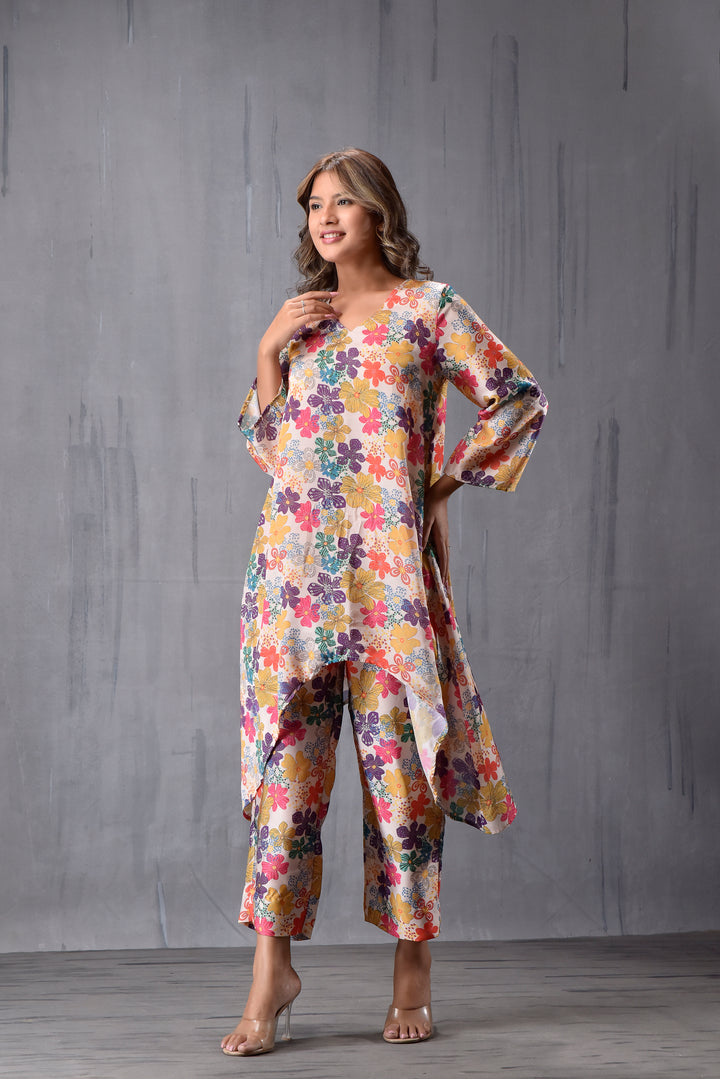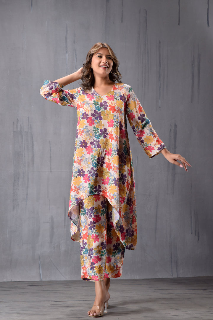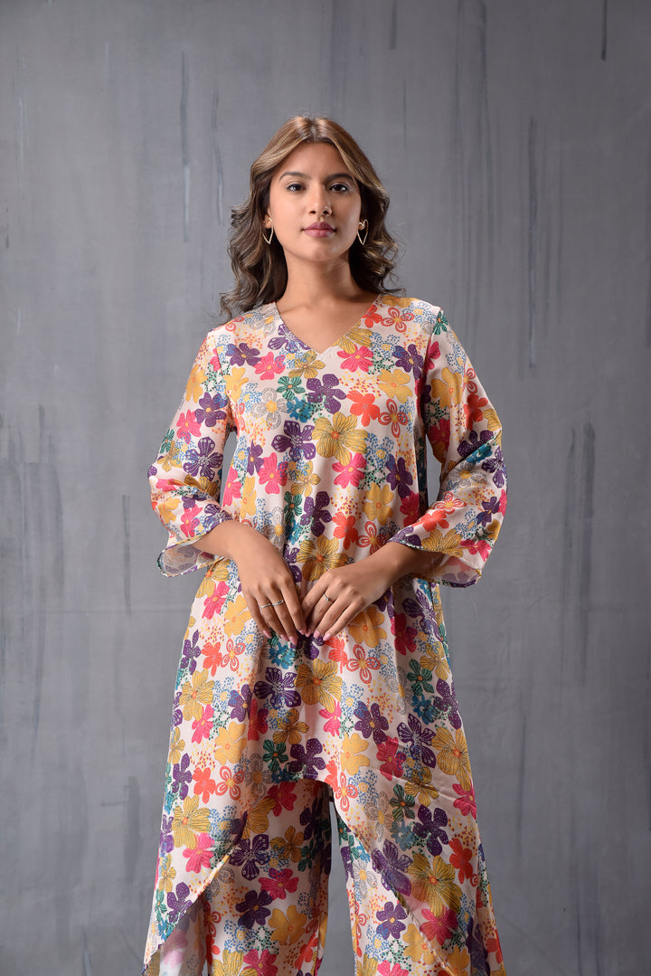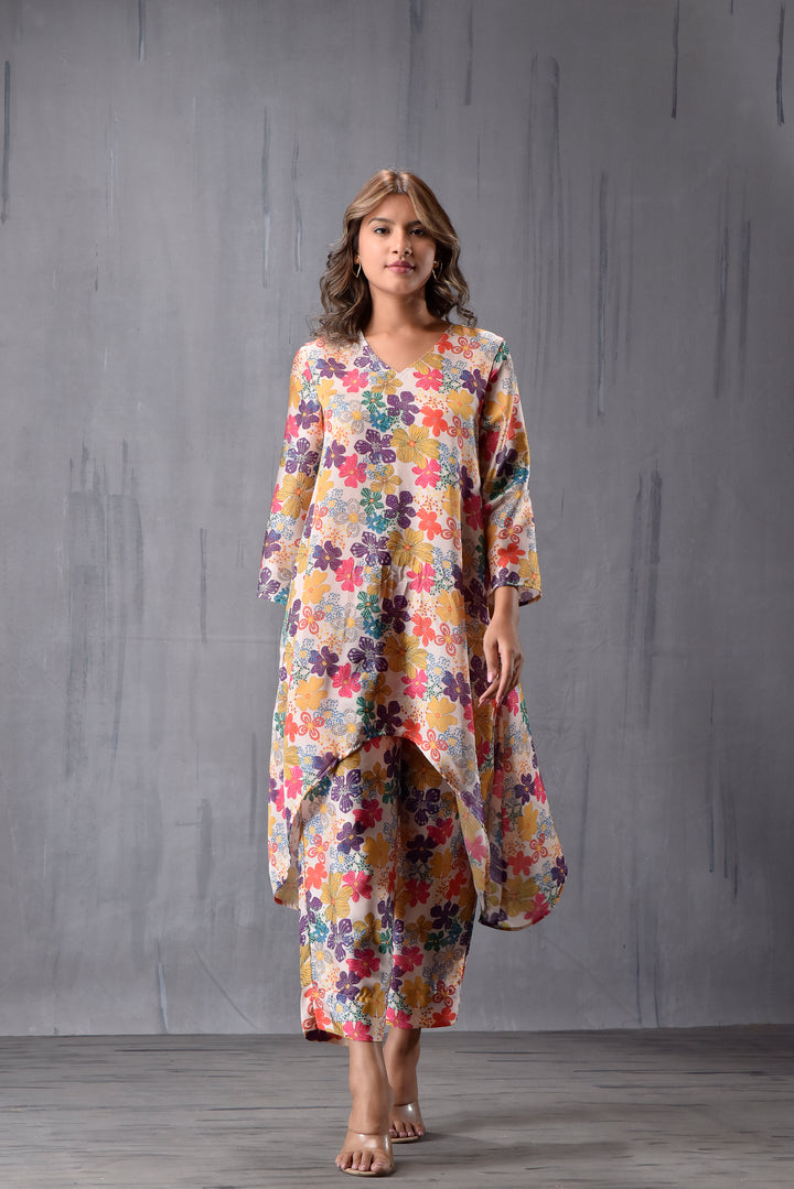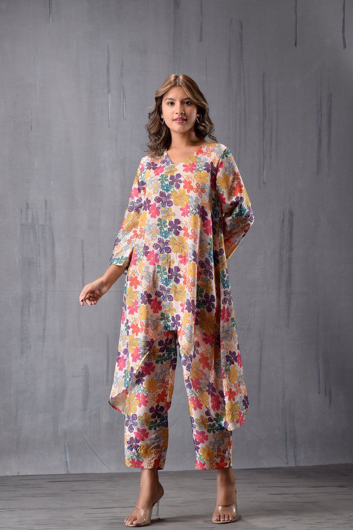 floral asymmetric kurta set This vibrant ensemble features an asymmetric hem kurta with a lively, multicolored floral print. The lightweight fabric and relaxed silhouette ensure comfort and elegance. Paired with matching straight-cut pants, this outfit is perfect for casual outings, festive gatherings, or summer events, giving a playful yet chic vibe