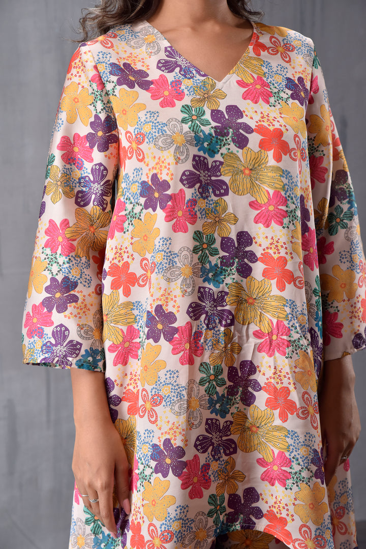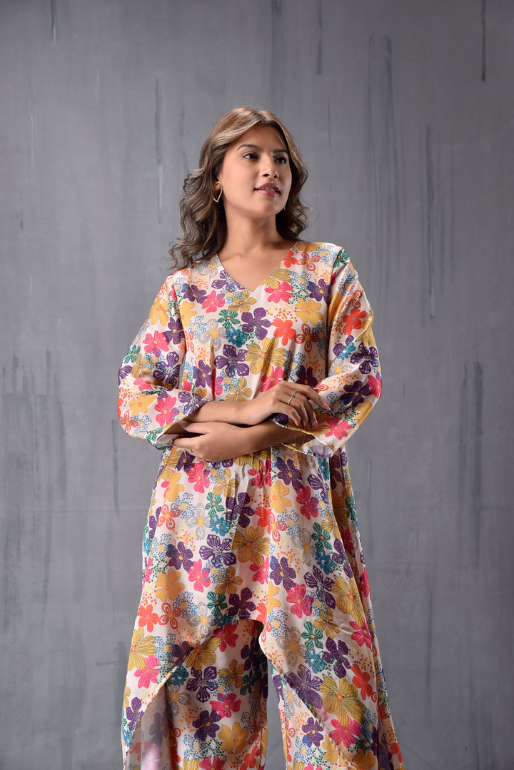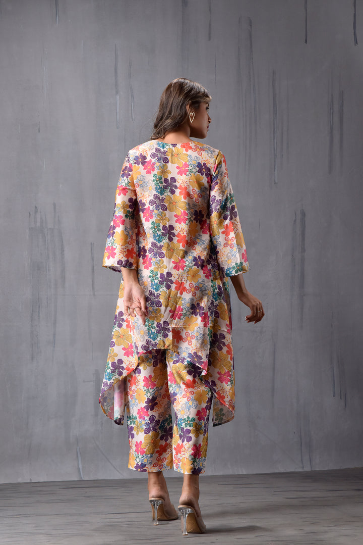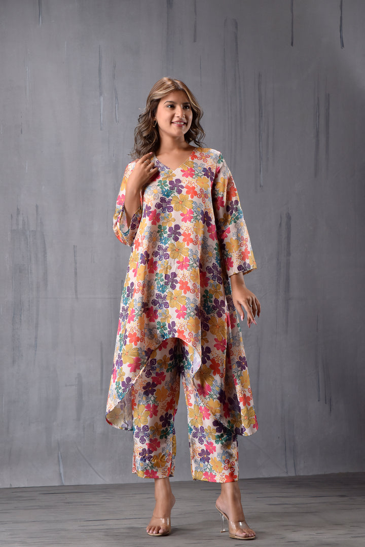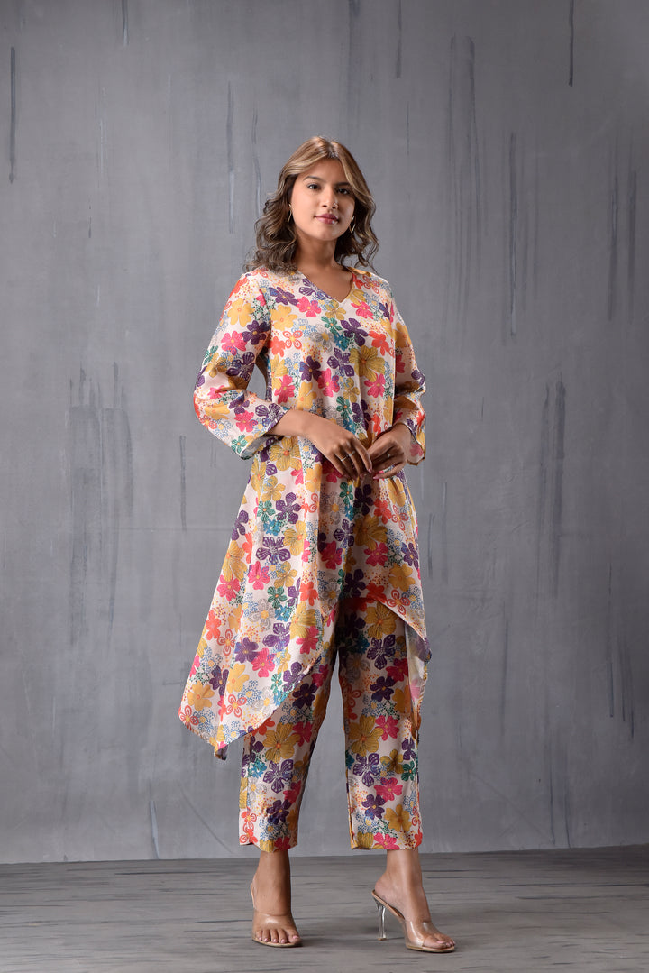 floral asymmetric kurta set This vibrant ensemble features an asymmetric hem kurta with a lively, multicolored floral print. The lightweight fabric and relaxed silhouette ensure comfort and elegance. Paired with matching straight-cut pants, this outfit is perfect for casual outings, festive gatherings, or summer events, giving a playful yet chic vibe