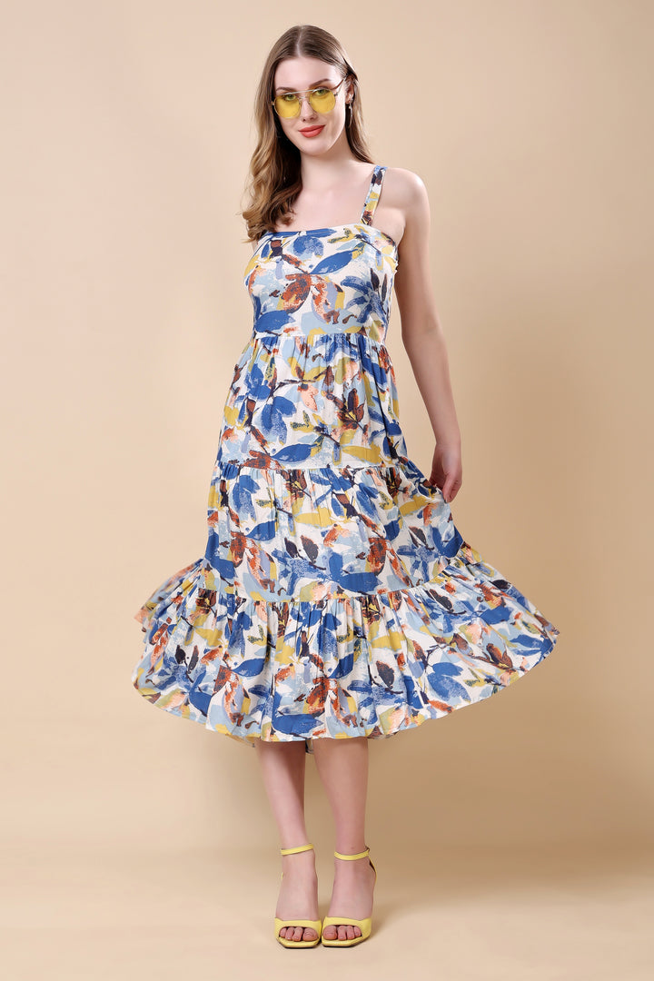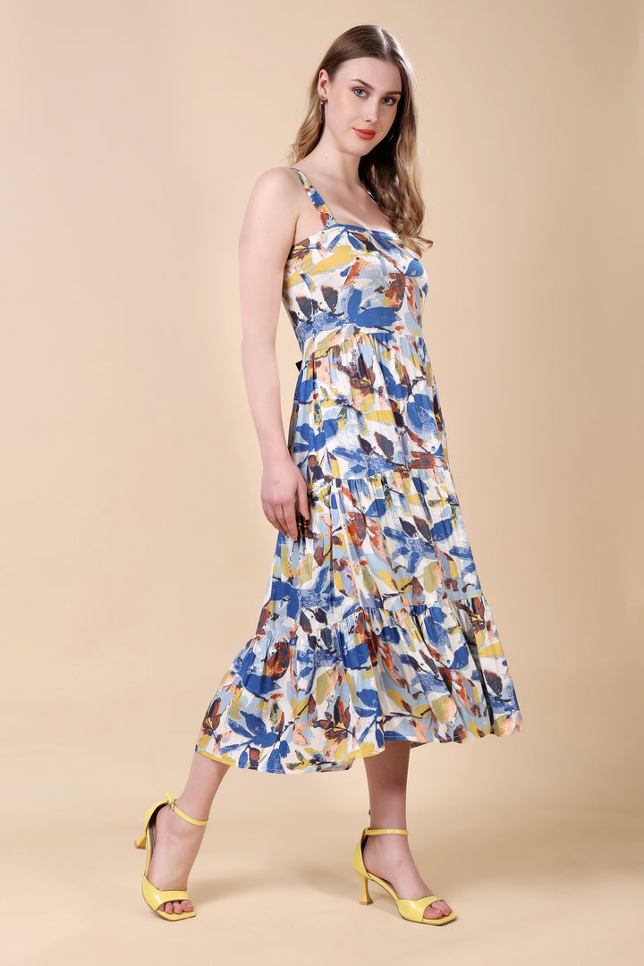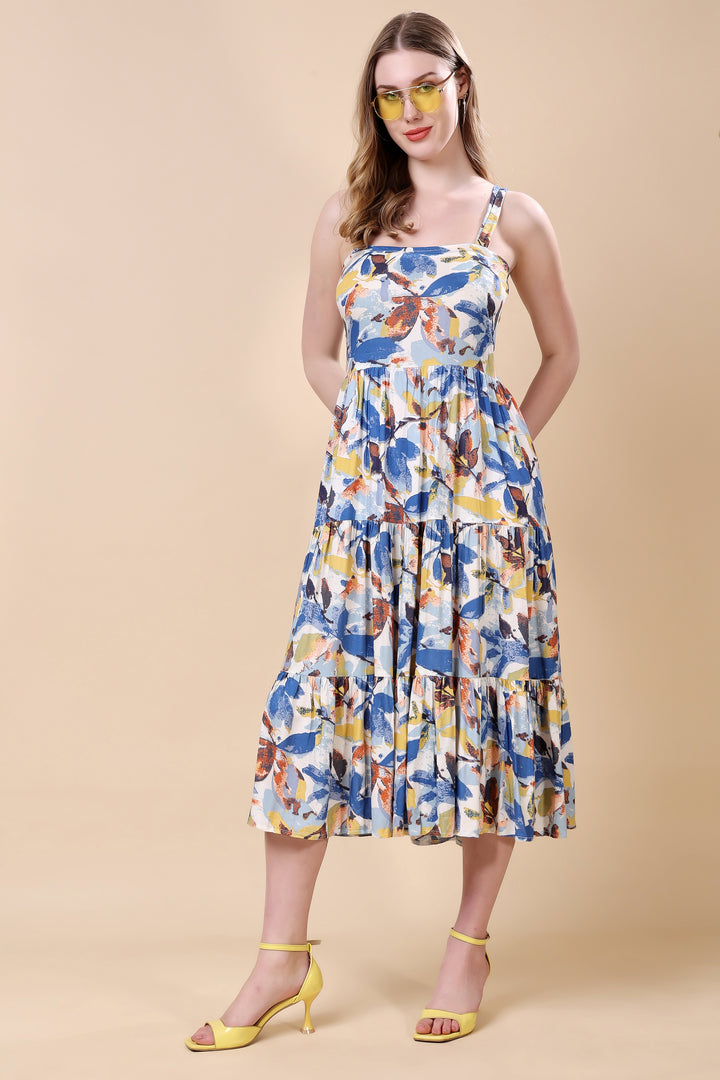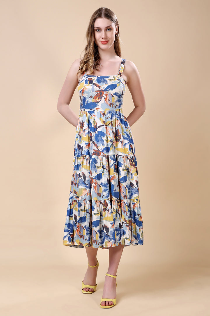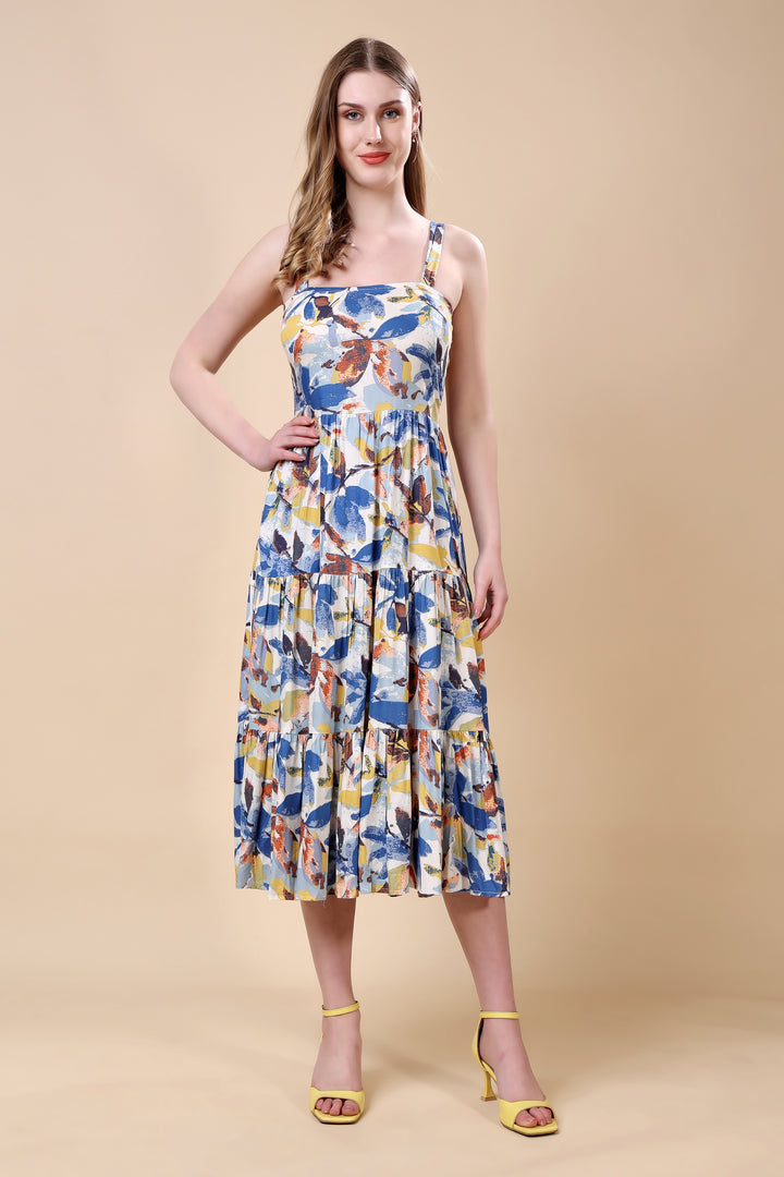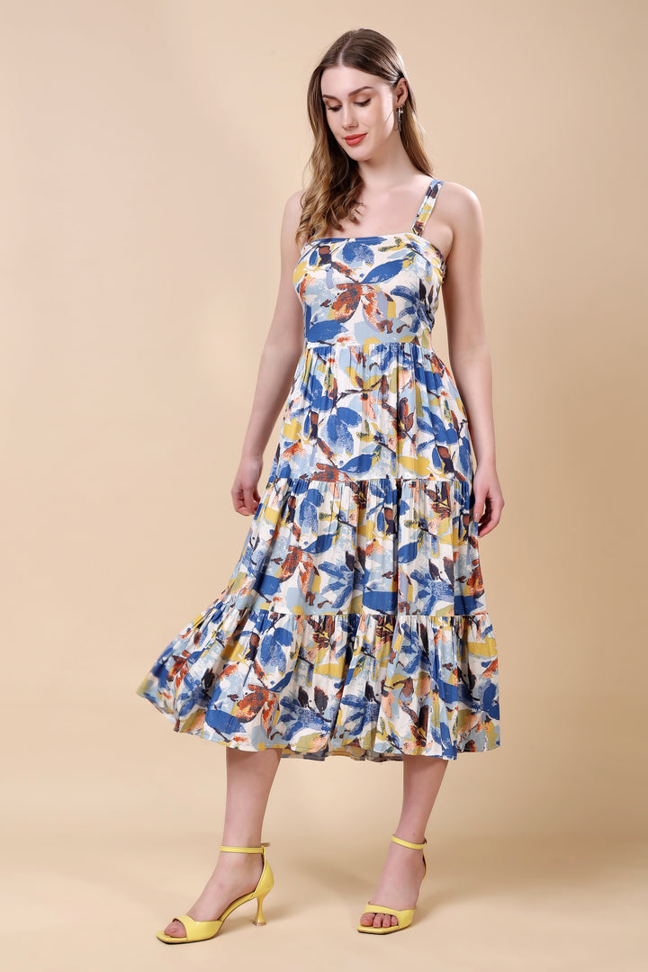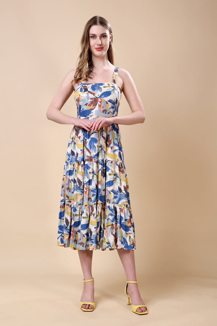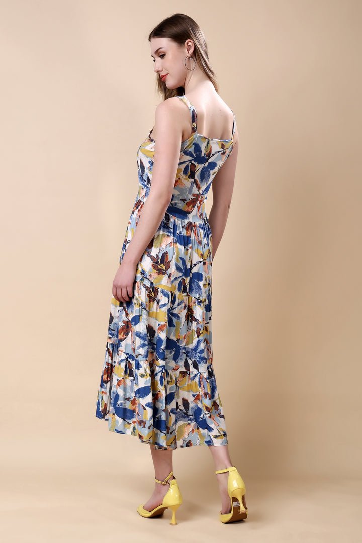 Floral Print Tired Maxi Dress: asymmetric kurta set This vibrant ensemble features an asymmetric hem kurta with a lively, multicolored floral print. The lightweight fabric and relaxed silhouette ensure comfort and elegance. Paired with matching straight-cut pants, this outfit is