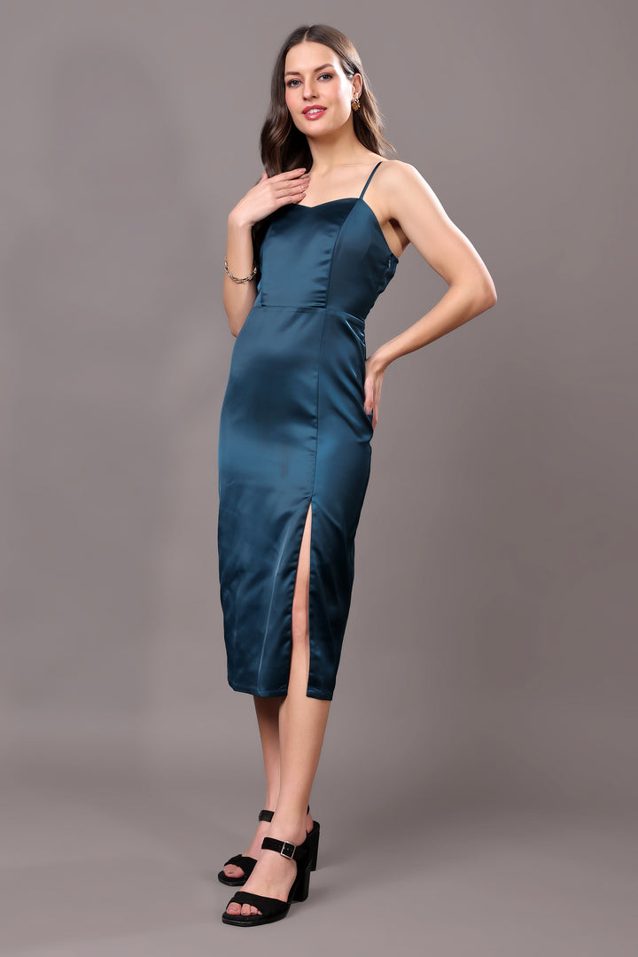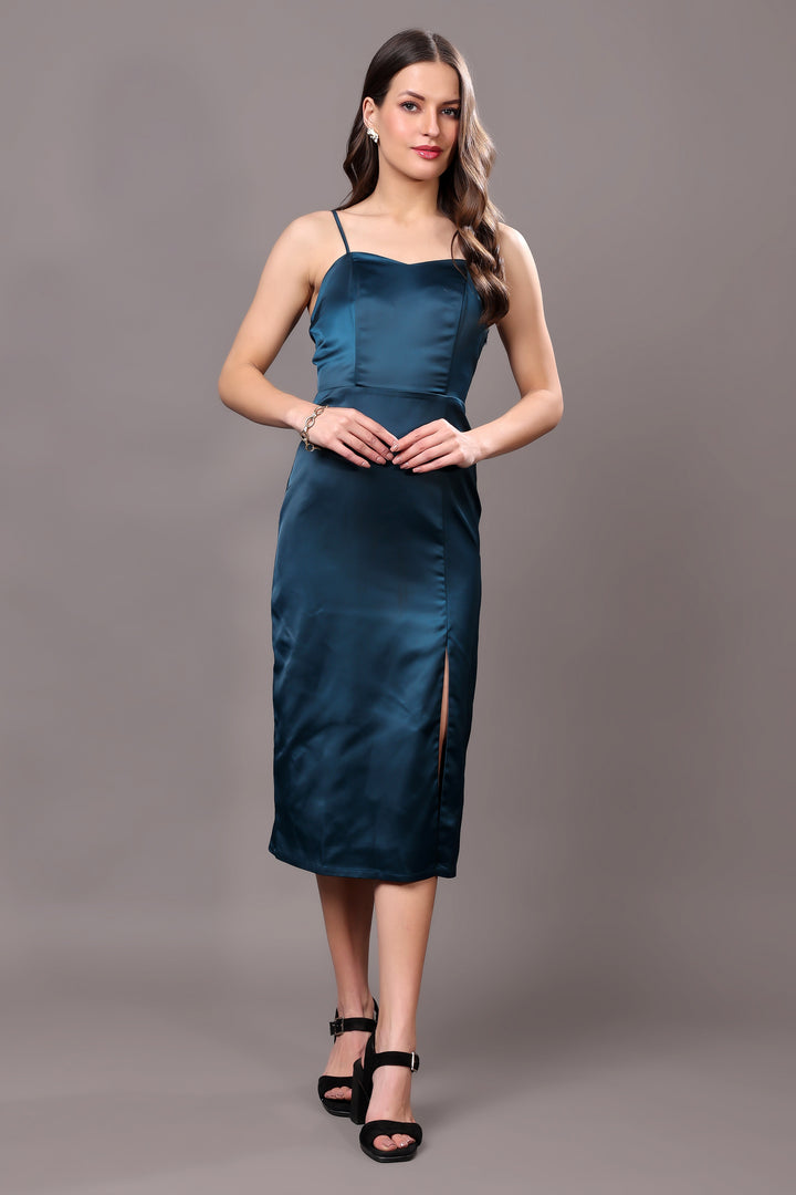 “Chic teal satin midi dress with a figure-flattering design, delicate spaghetti straps, and a stylish thigh-high slit for a modern look.”