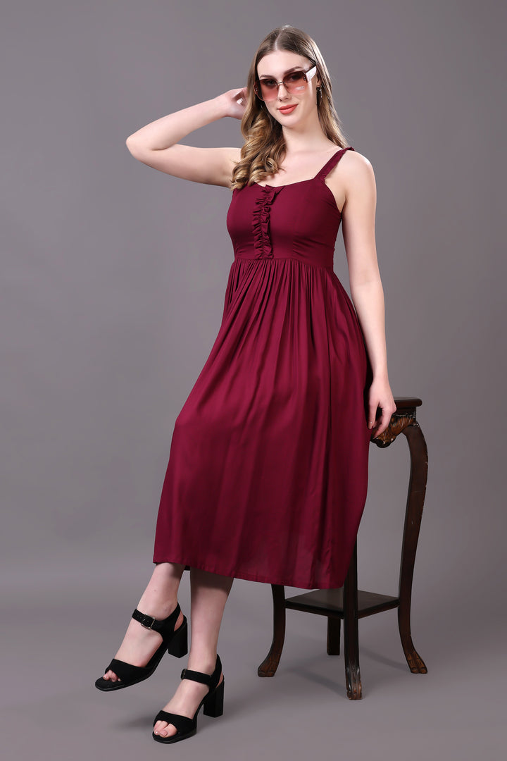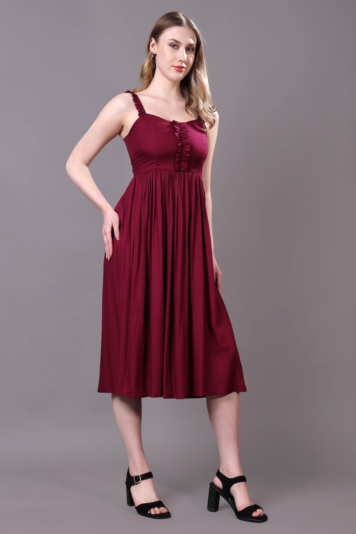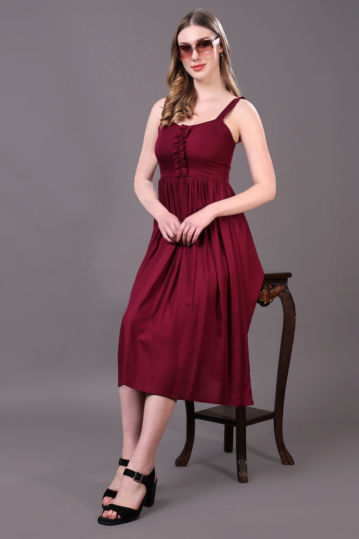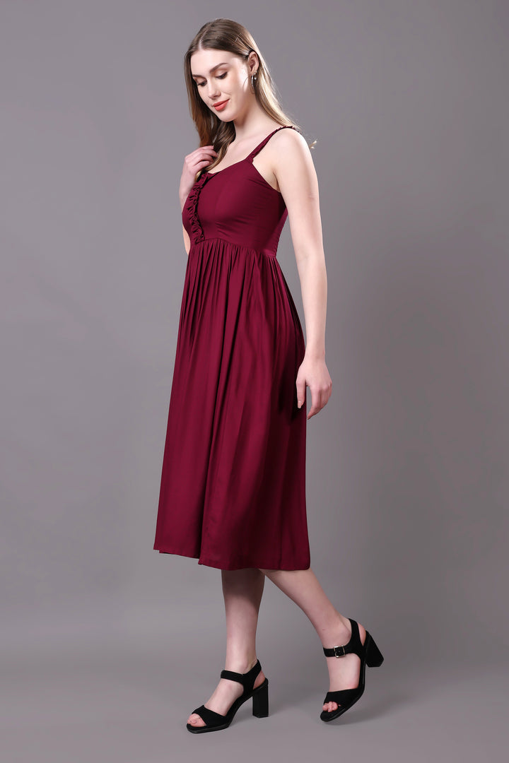 Wine Red Ruffle Detail Midi Dress : Elevate your style with this elegant wine-red midi dress featuring subtle ruffle details along the bust. The fitted bodice and flowy skirt create a flattering silhouette, making it an ideal choice for both casual and semi-formal occasions. Made from lightweight, breathable fabric, it ensures maximum comfort. Pair it with heels and statement earrings to complete your look.