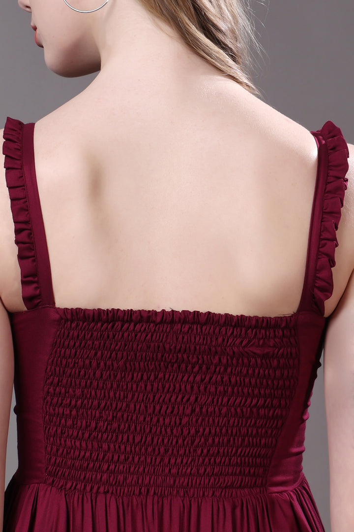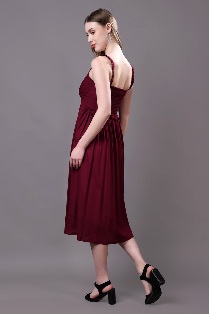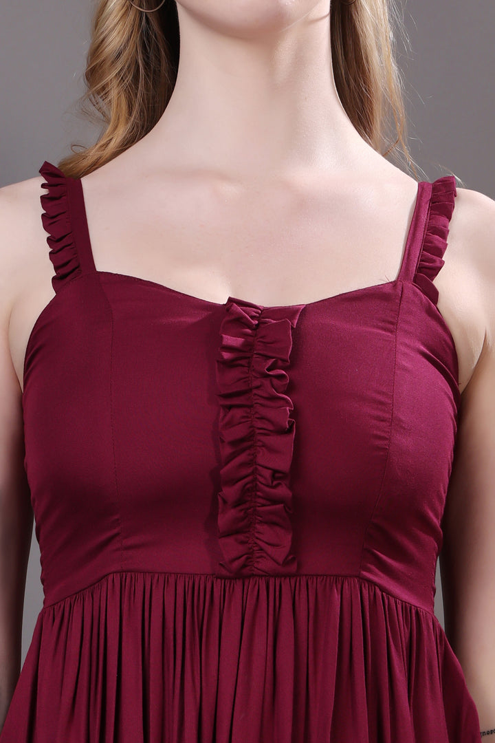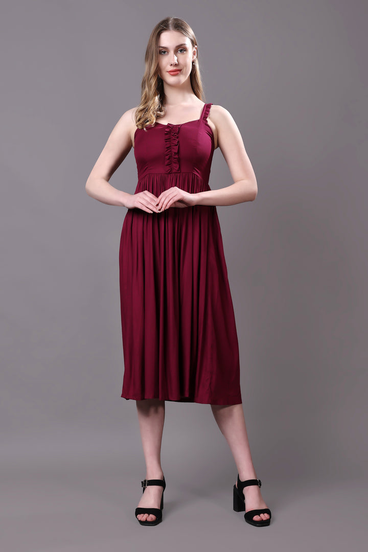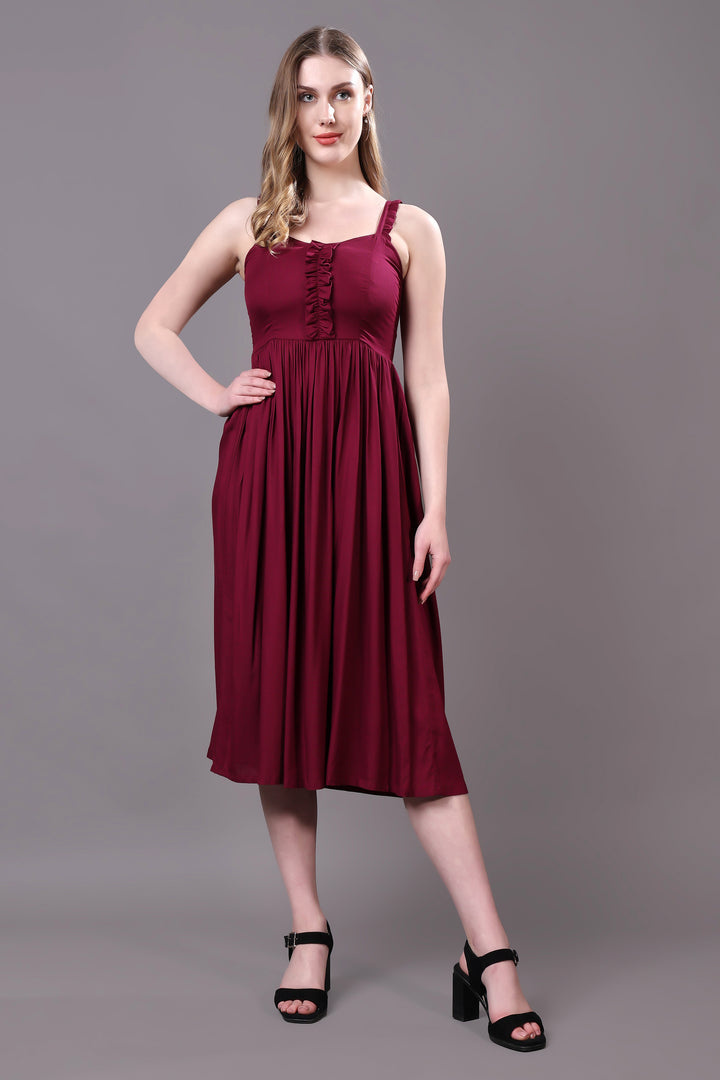 Wine Red Ruffle Detail Midi Dress : Elevate your style with this elegant wine-red midi dress featuring subtle ruffle details along the bust. The fitted bodice and flowy skirt create a flattering silhouette, making it an ideal choice for both casual and semi-formal occasions. Made from lightweight, breathable fabric, it ensures maximum comfort. Pair it with heels and statement earrings to complete your look.