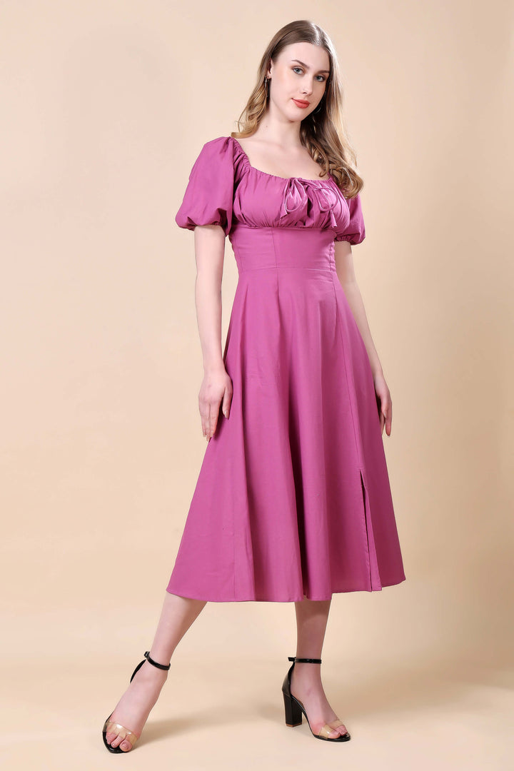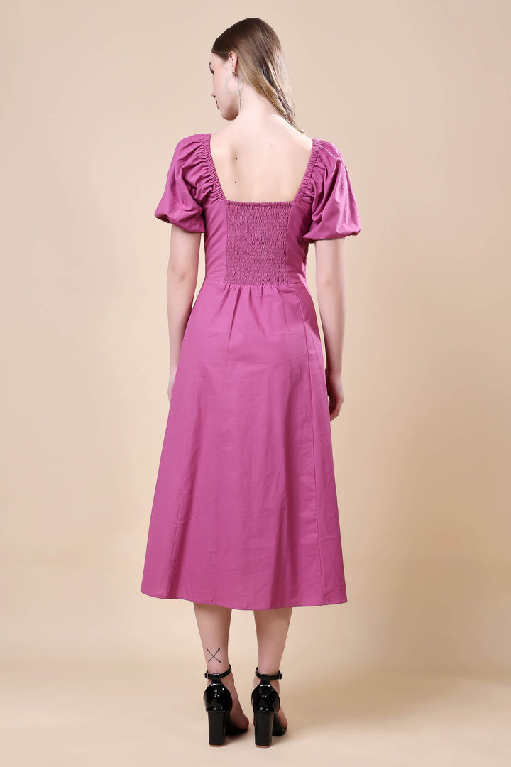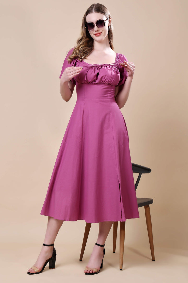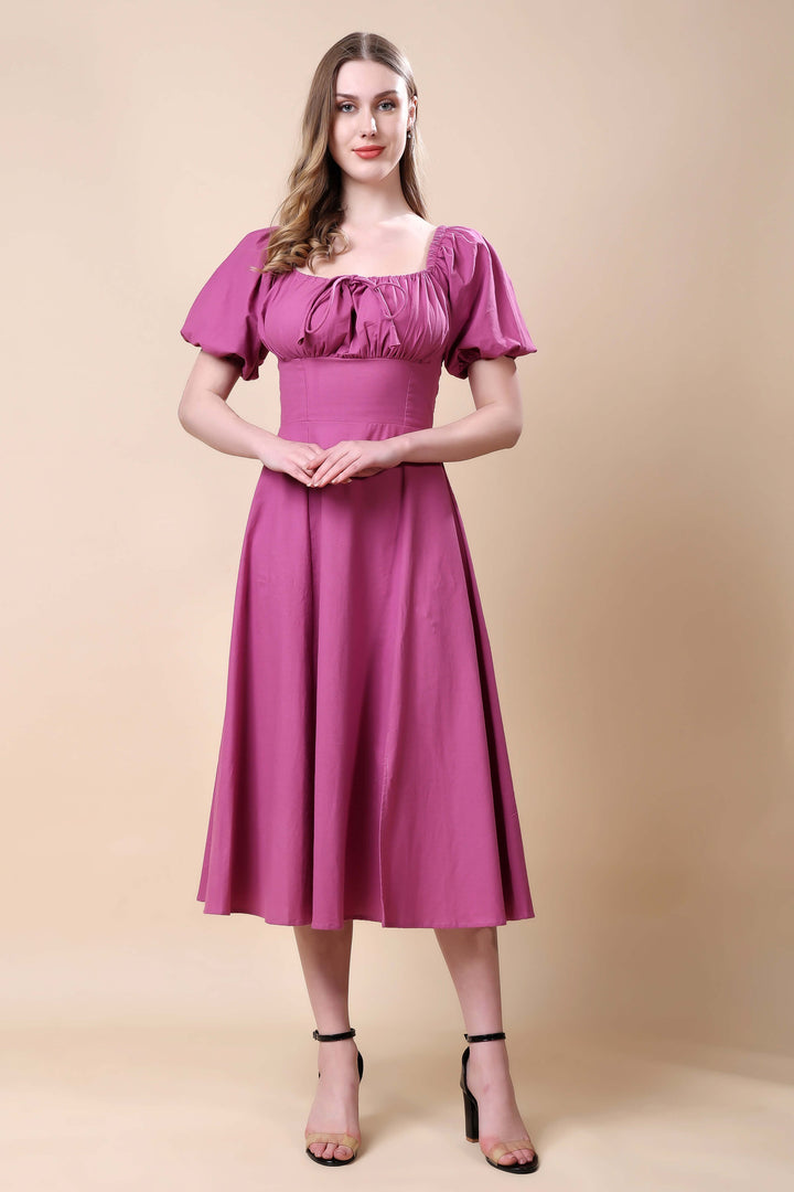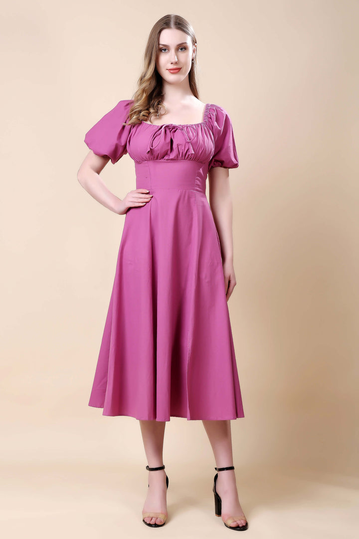 Step into effortless elegance with this mauve midi dress, designed to flatter every silhouette. Featuring a square neckline with delicate gathered detailing and charming puff sleeves, this dress beautifully blends classic femininity with modern grace. The fitted bodice accentuates the waist, flowing into a flared A-line skirt that moves with ease. Perfect for brunches, daytime events, or casual evenings, this versatile piece pairs effortlessly with heels or flats for a polished look.