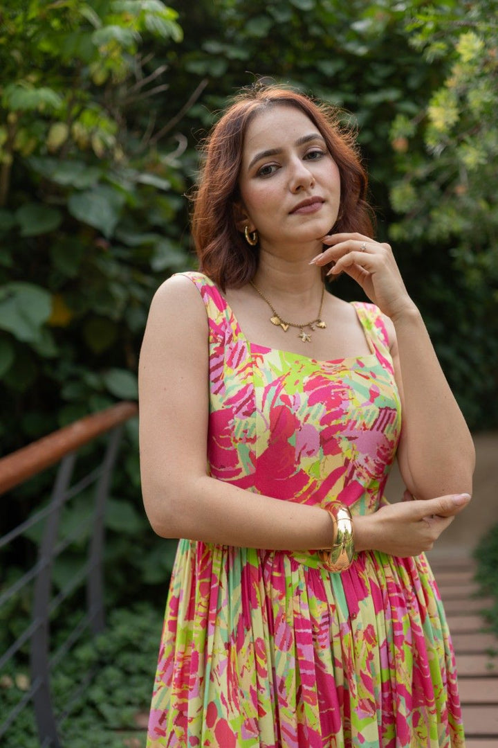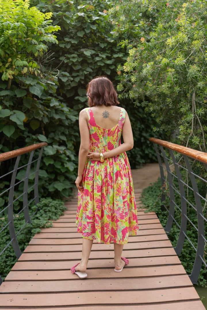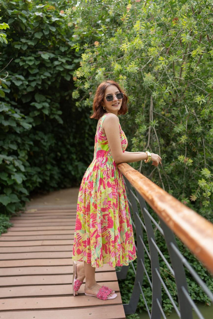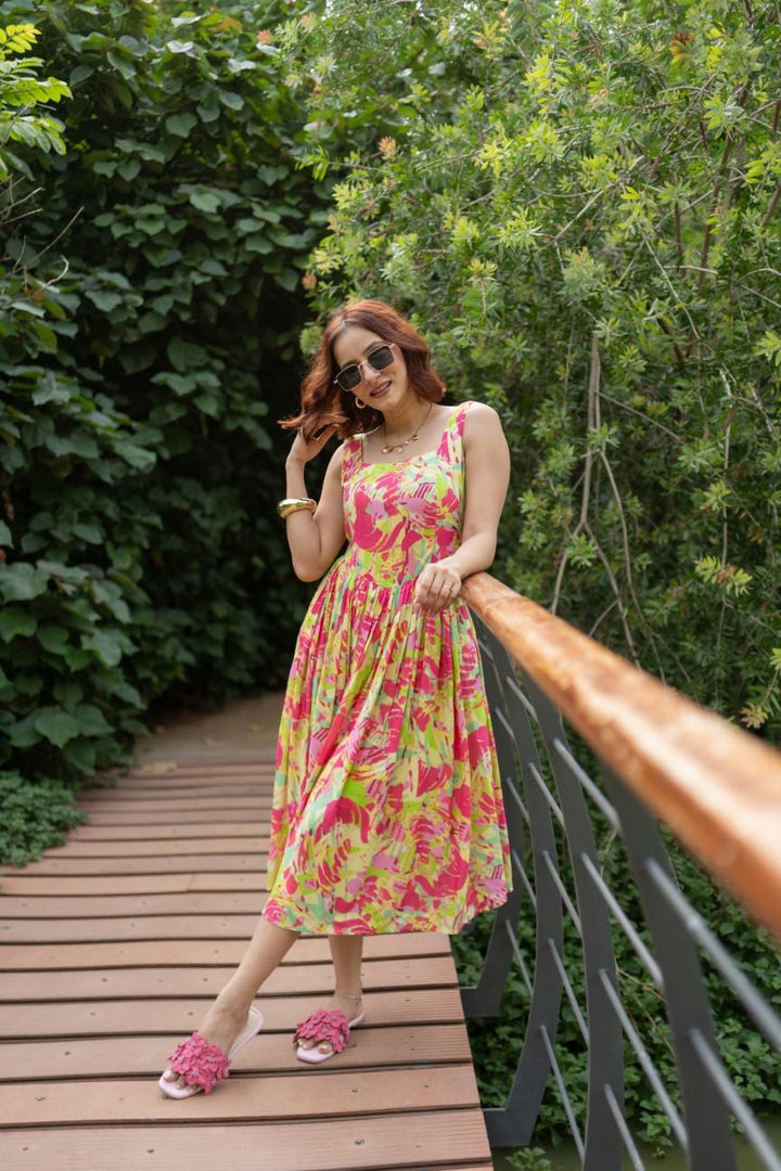 This stunning floral midi dress is perfect for a chic and effortless style. The sleeveless design features a vibrant pink and green floral pattern, creating a flattering silhouette. Paired with pink sandals, this outfit exudes understated elegance. Ideal for a variety of occasions, this dress is sure to make a statement.