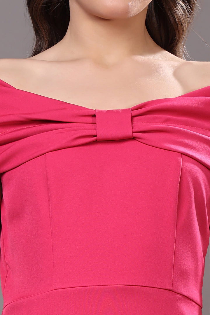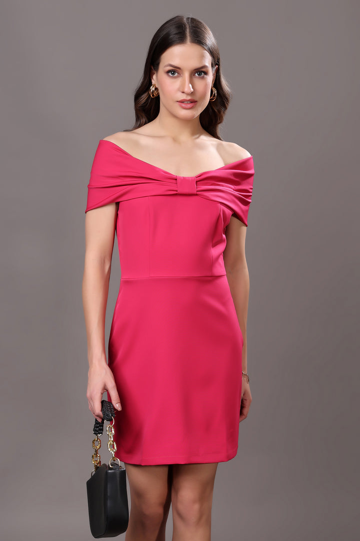 Pink Off-Shoulder Mini Dress: This elegant pink off-shoulder mini dress features a chic bow detail at the neckline, exuding a feminine charm. Crafted from a comfortable fabric, it offers a flattering fit and falls gracefully above the knee, making it a perfect choice for cocktail parties or casual outings. Pair it with nude heels for a sophisticated look.