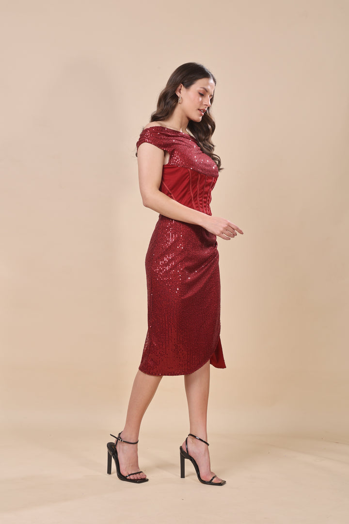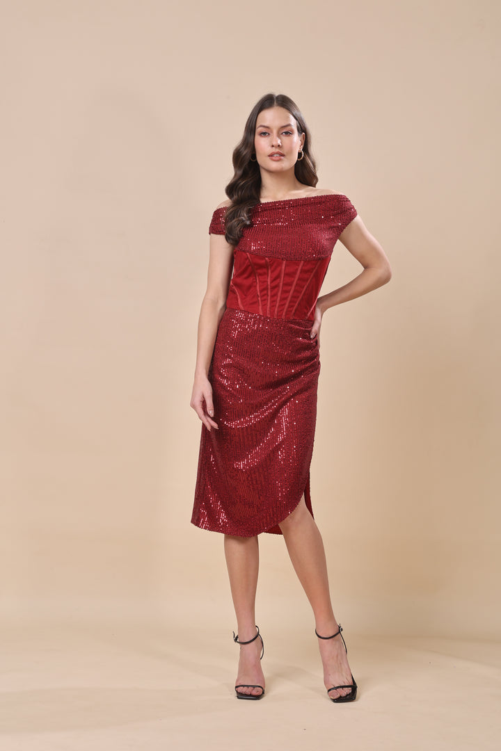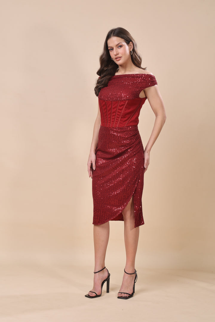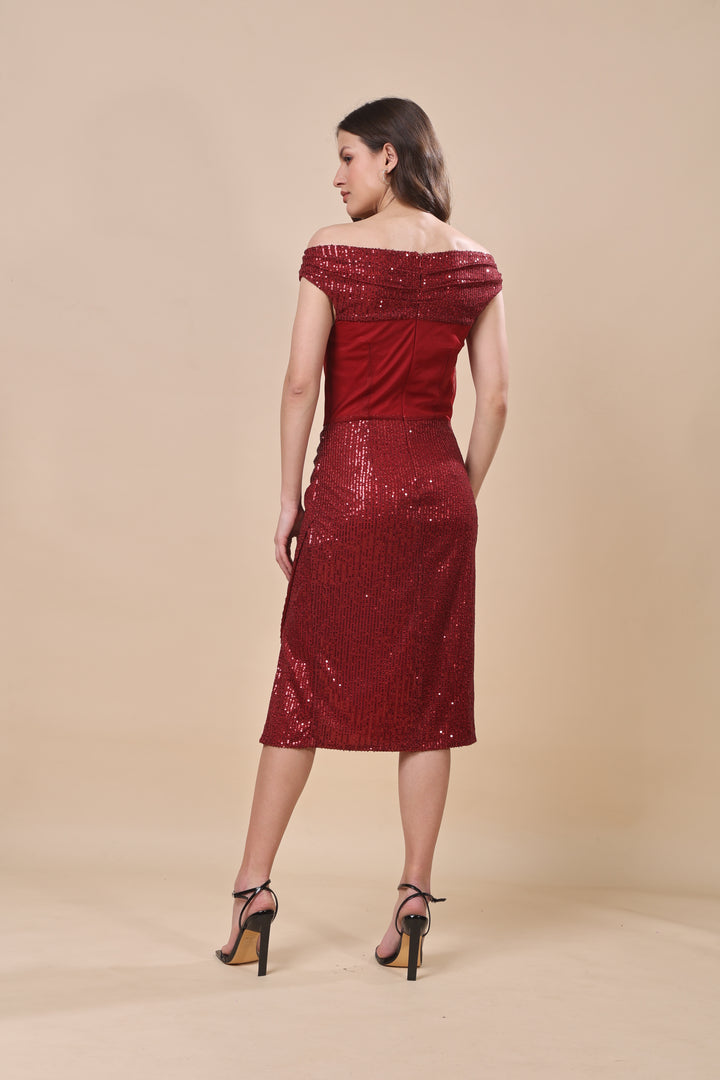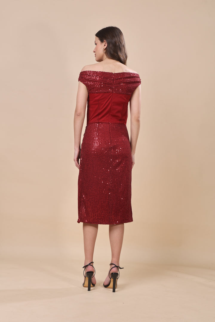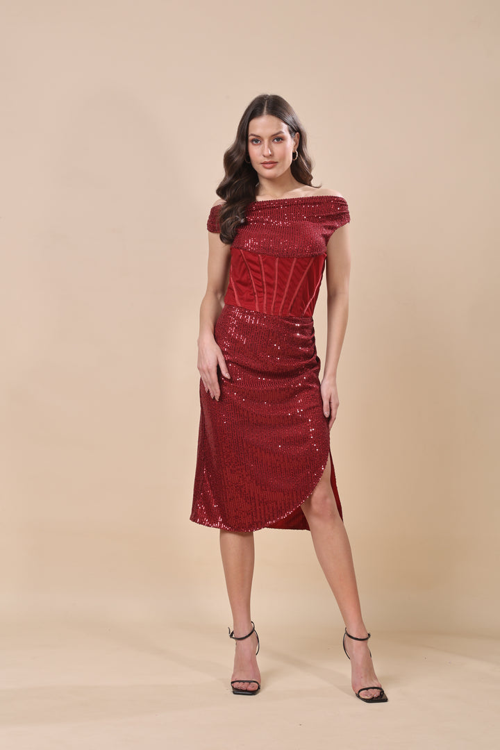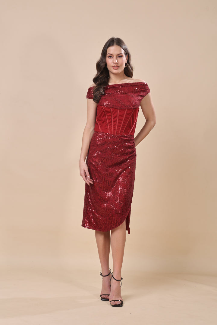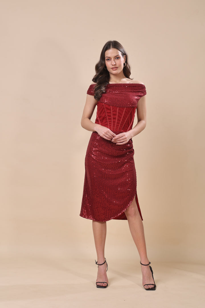 Red Sequin Off-Shoulder Dress Turn heads in this bold red off-shoulder dress, enhanced with dazzling sequins and a body-hugging fit. Ideal for festive gatherings and glamorous events.
