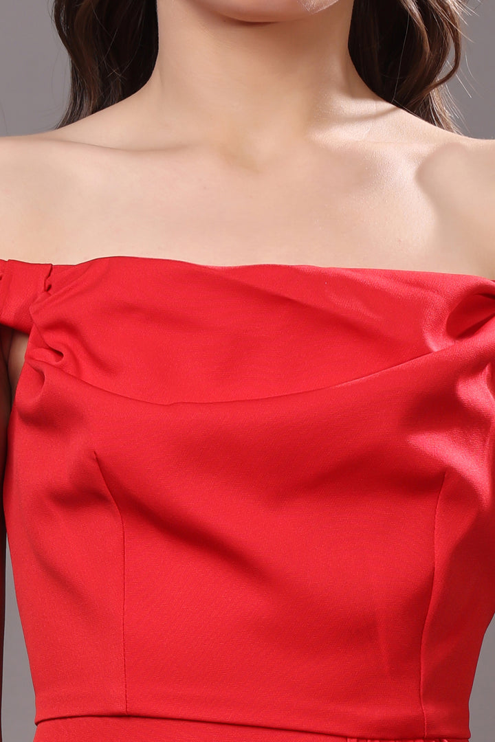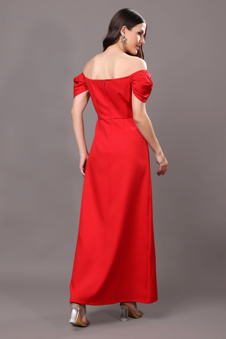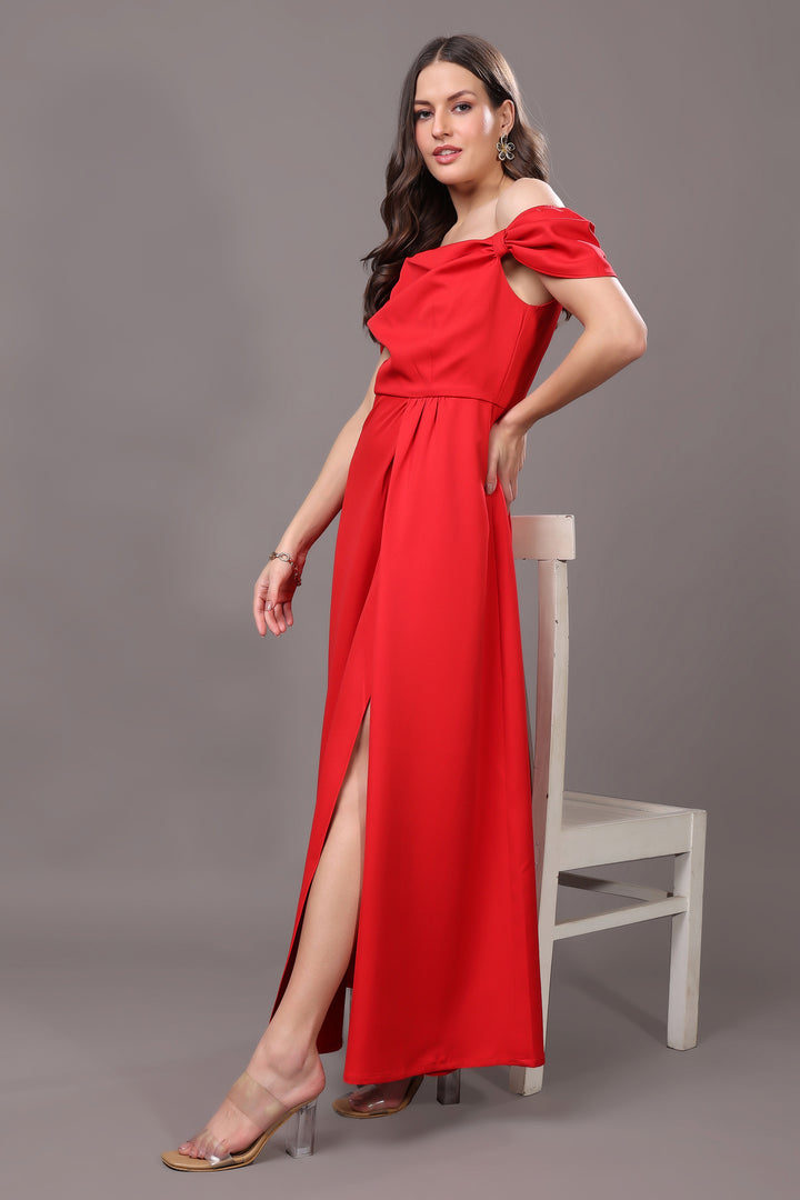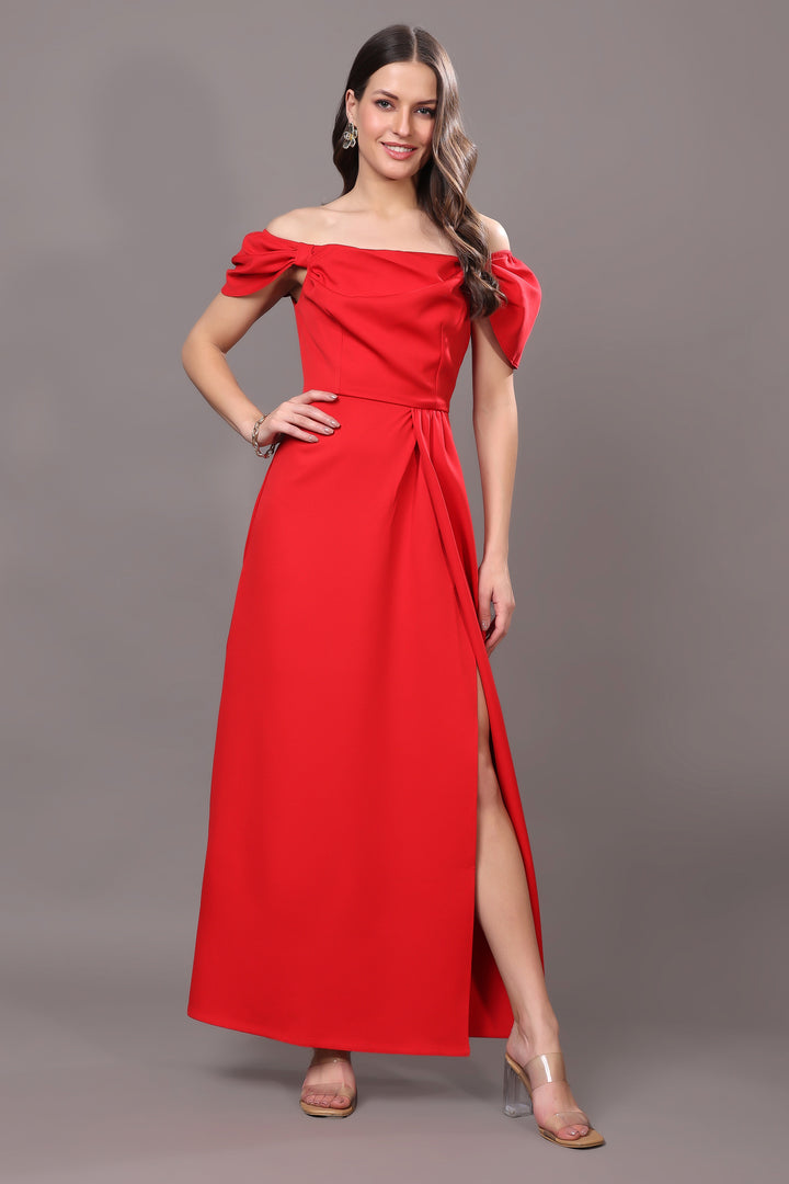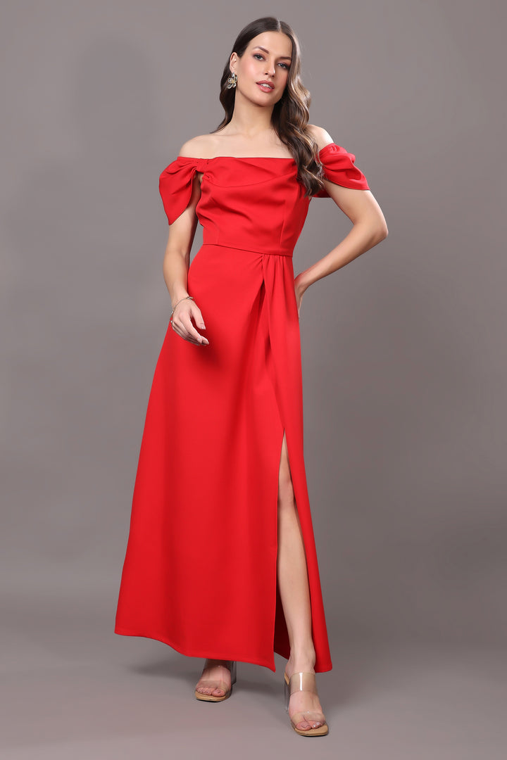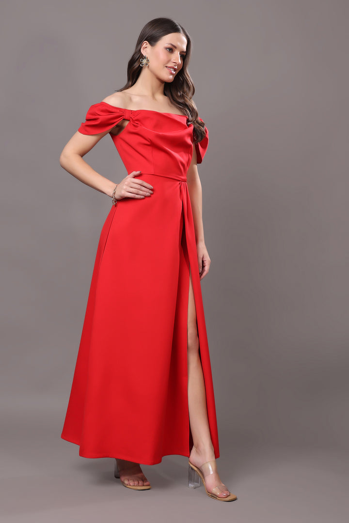 This is an elegant, off-shoulder gown with a fitted bodice The dress features a thigh-high slit on one side, adding a touch of sophistication.wrap detail at the waist enhances the silhouette, making it flattering and gracefIt is paired with minimalistic clear block-heeled sandals.