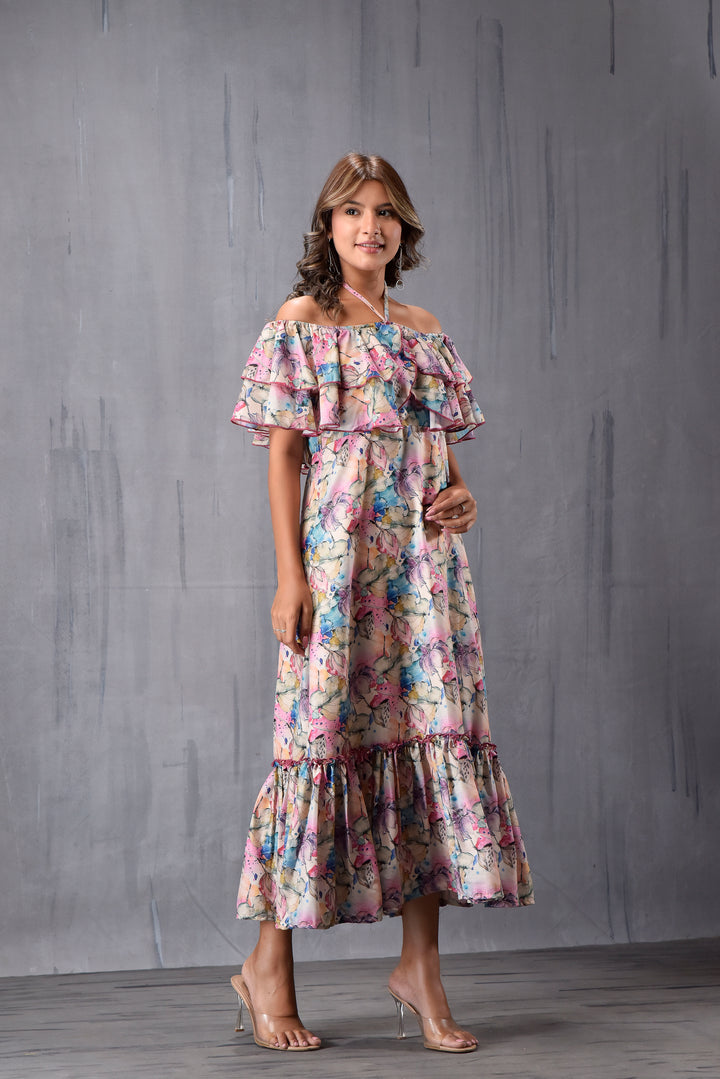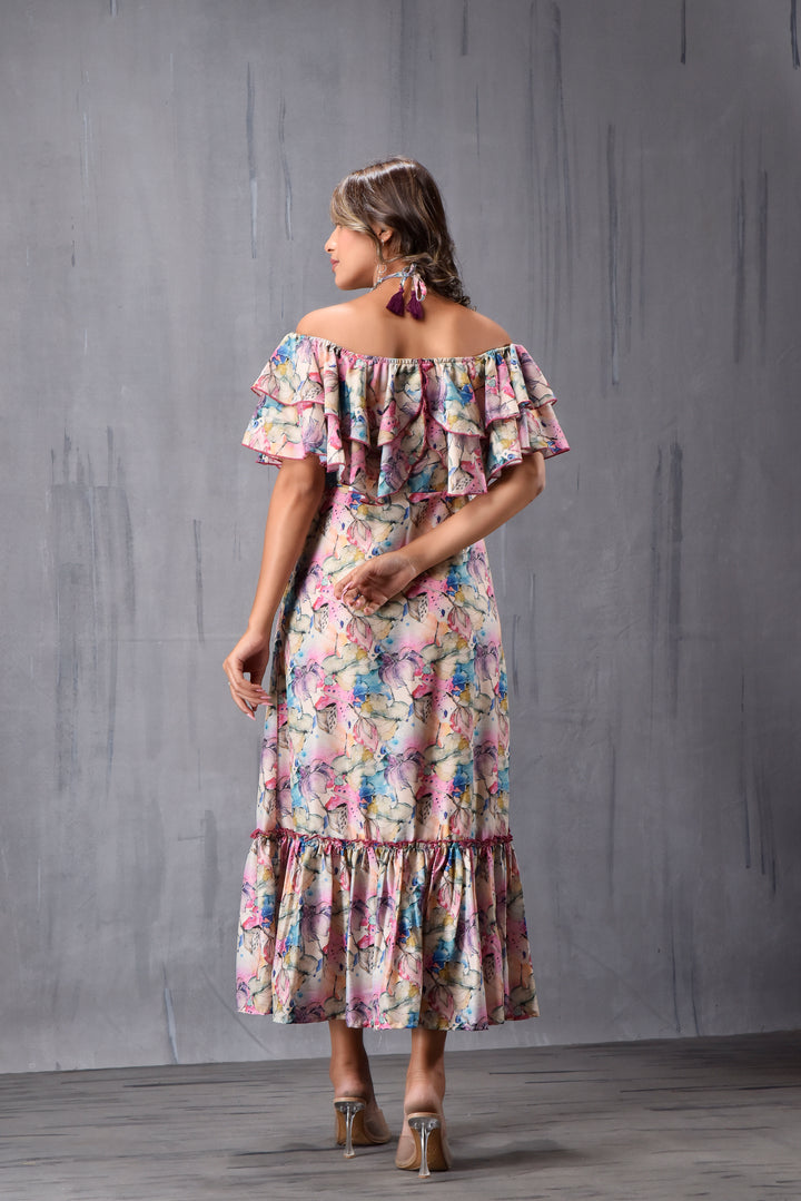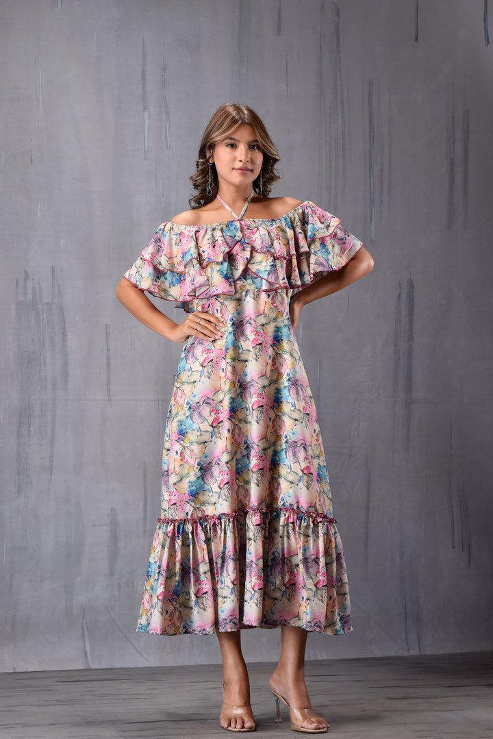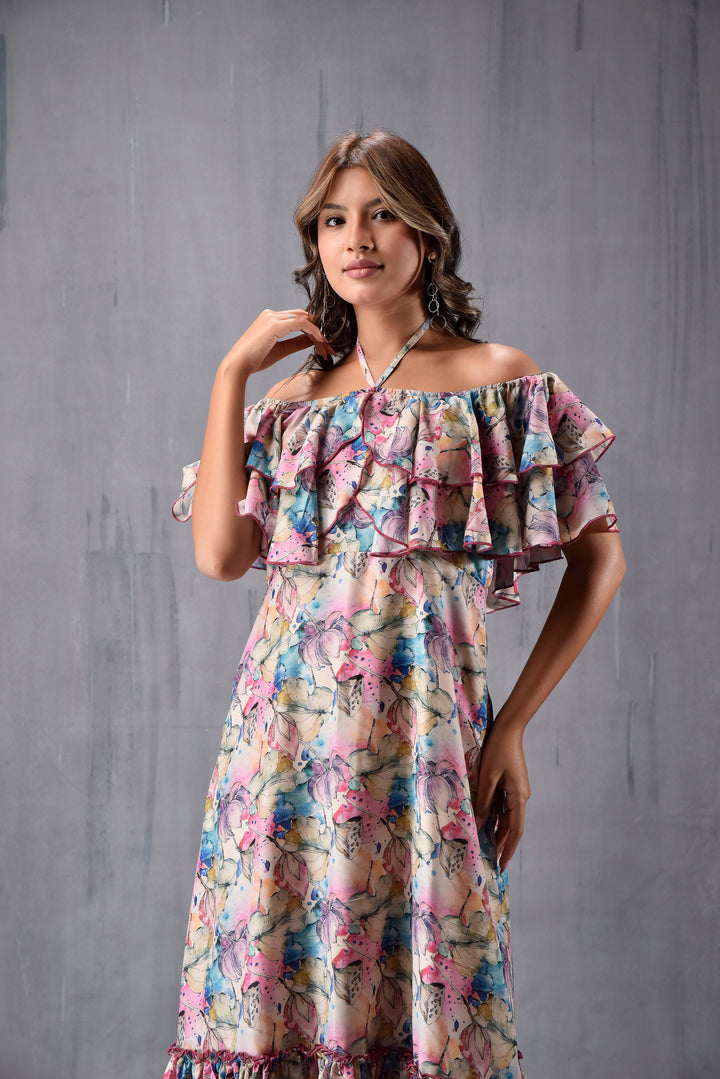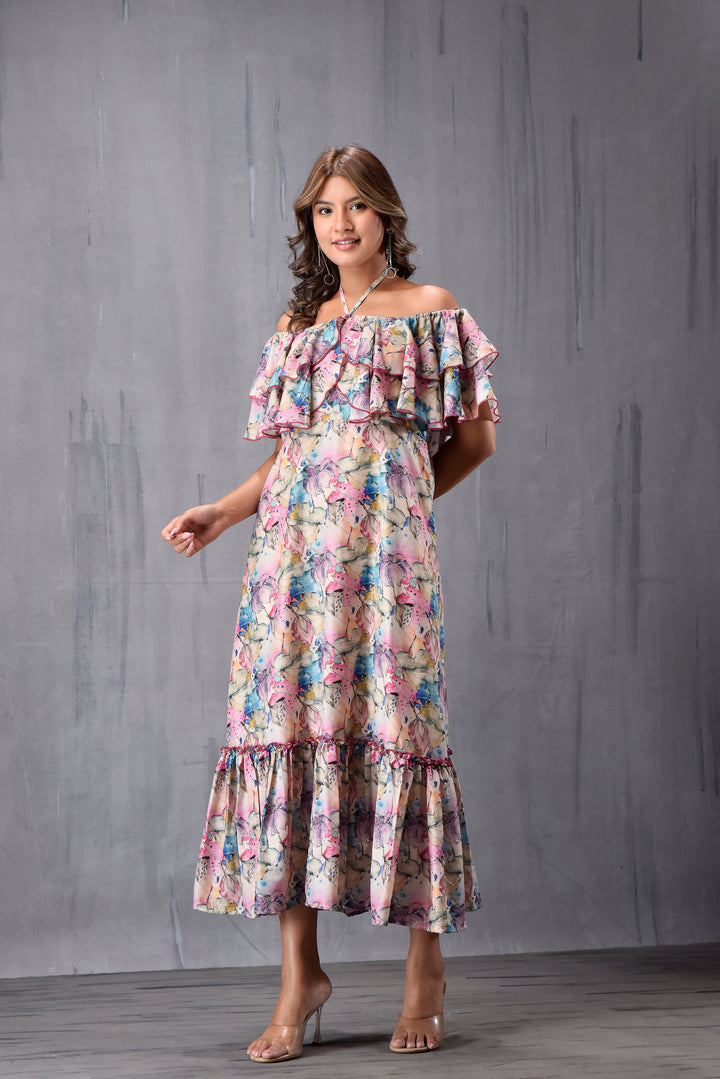 “Elegant off-shoulder floral maxi dress featuring vibrant pastel hues with splashes of pink, blue, and lavender. Designed with layered ruffle detailing and a flowy silhouette, it’s perfect for casual outings, vacations, and summer events.”