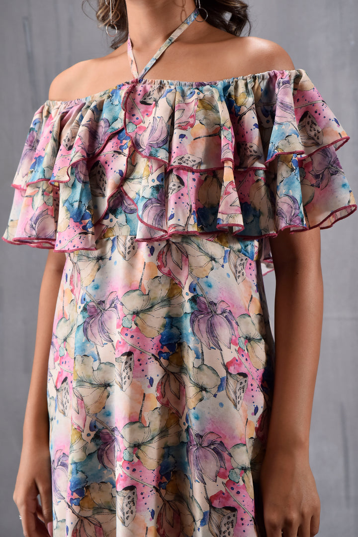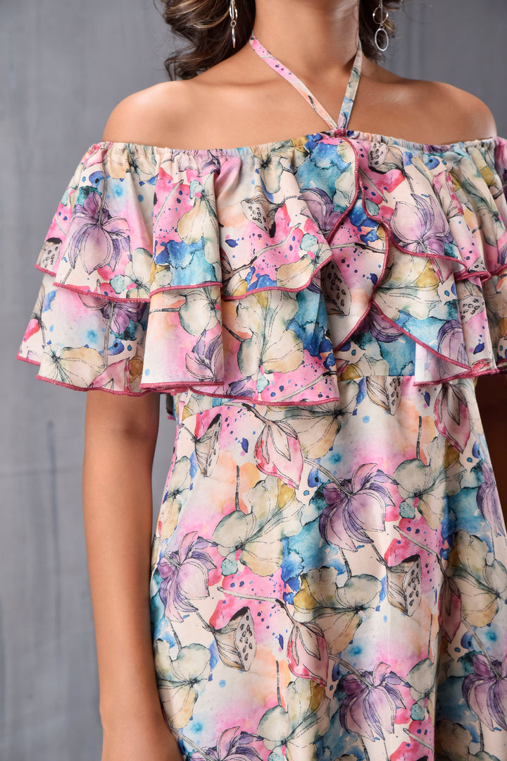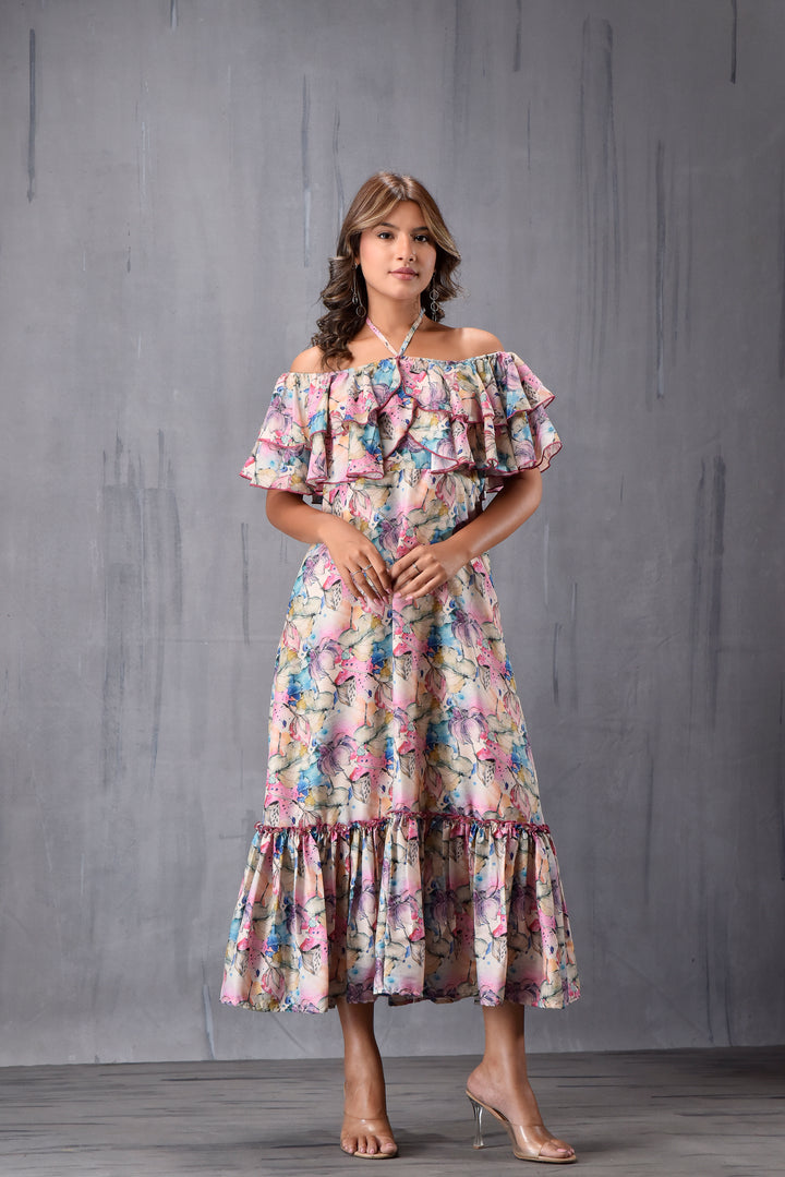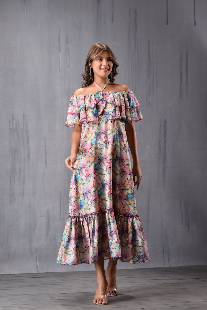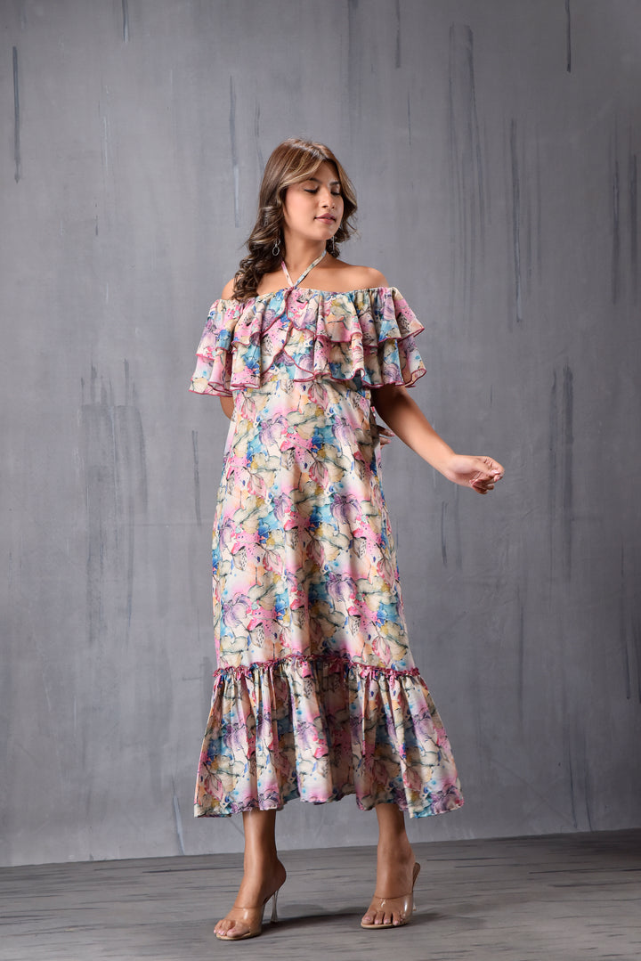 “Elegant off-shoulder floral maxi dress featuring vibrant pastel hues with splashes of pink, blue, and lavender. Designed with layered ruffle detailing and a flowy silhouette, it’s perfect for casual outings, vacations, and summer events.”