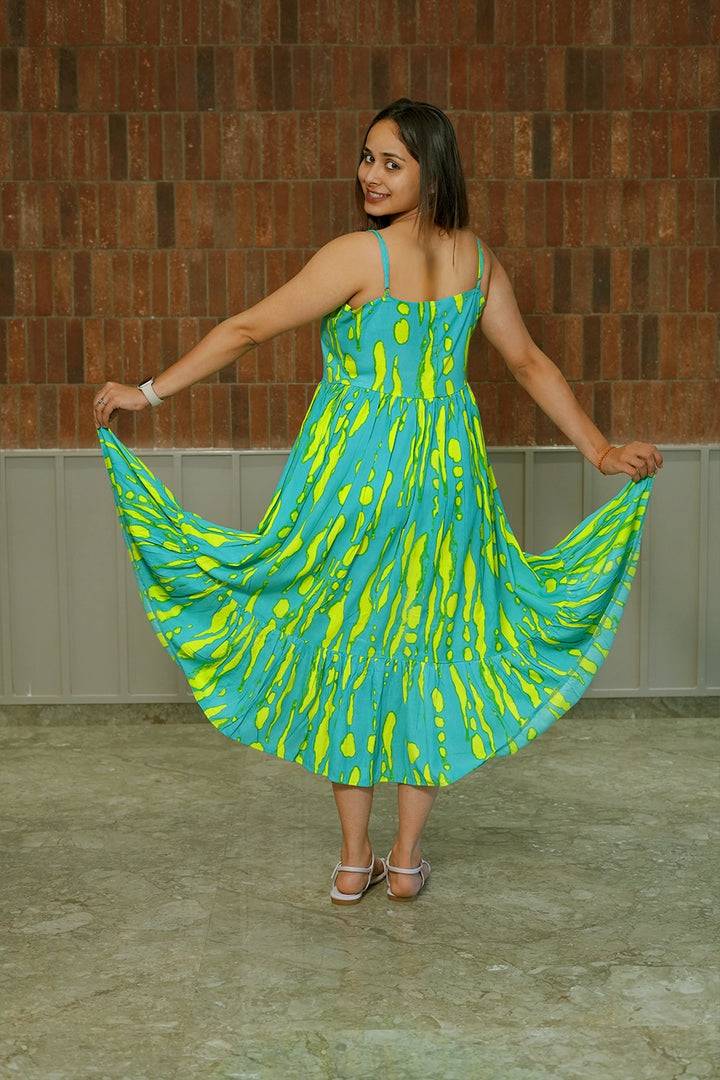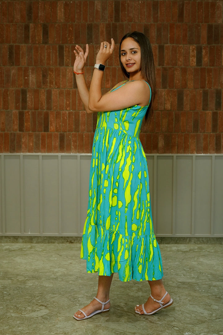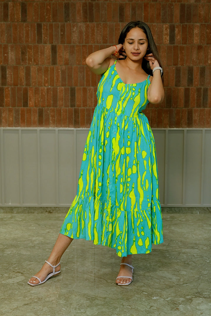 Turn heads this summer with our vibrant Sleeveless Maxi Dress, featuring a bold turquoise blue and neon yellow abstract print. Crafted from soft, breathable fabric, this dress offers a comfortable, relaxed fit with a flattering A-line silhouette and adjustable spaghetti straps. Perfect for beach trips, casual outings, or any warm-weather event, it effortlessly combines style and comfort. Easy to care for, it’s machine washable and ready to become your go-to choice for chic, standout looks.