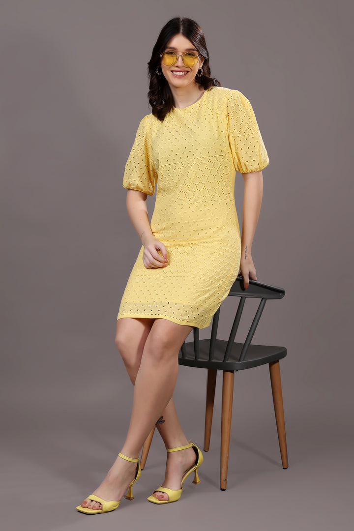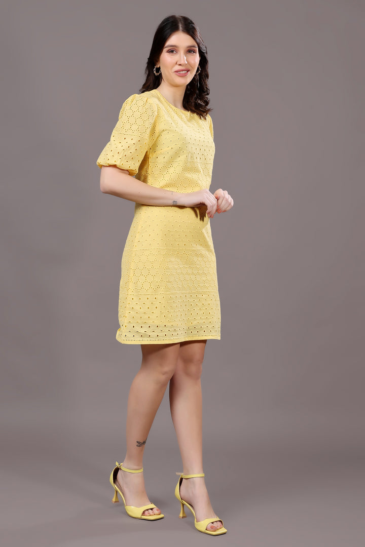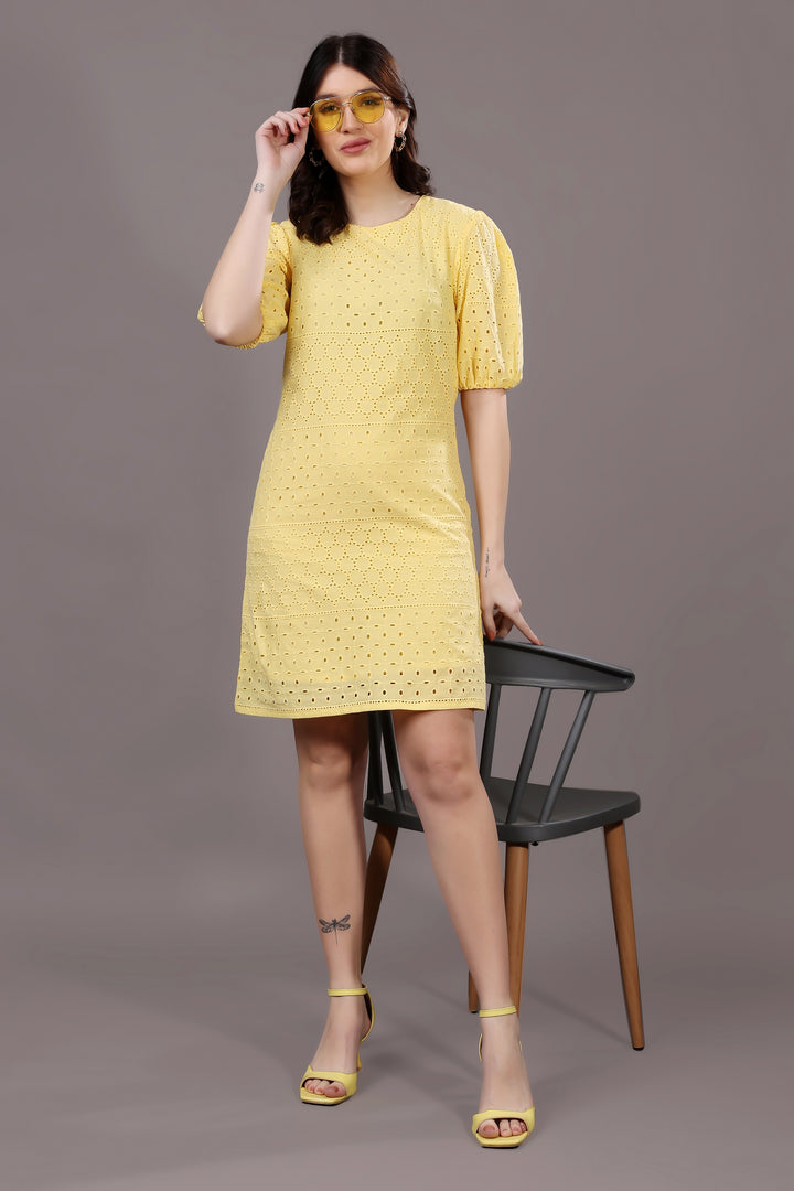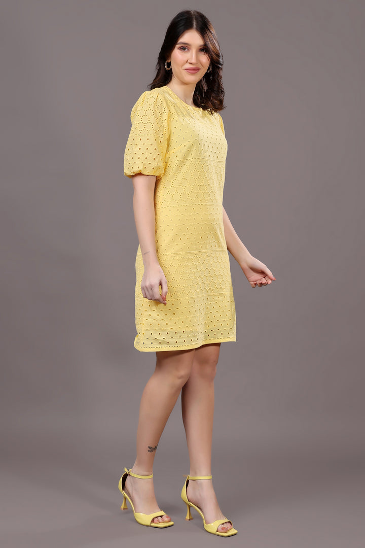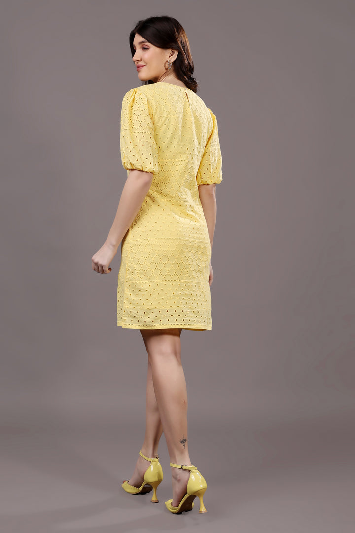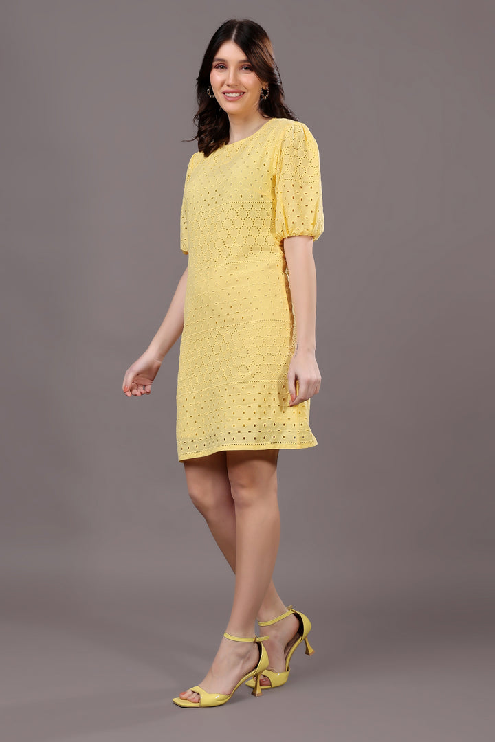 Crafted from breathable schiffli fabric, this yellow mini dress features delicate eyelet detailing and puffed sleeves. The soft and lightweight material ensures all-day comfort, making it ideal for sunny outings or casual meetups. Its relaxed fit and vibrant color add a touch of freshness to your wardrobe.