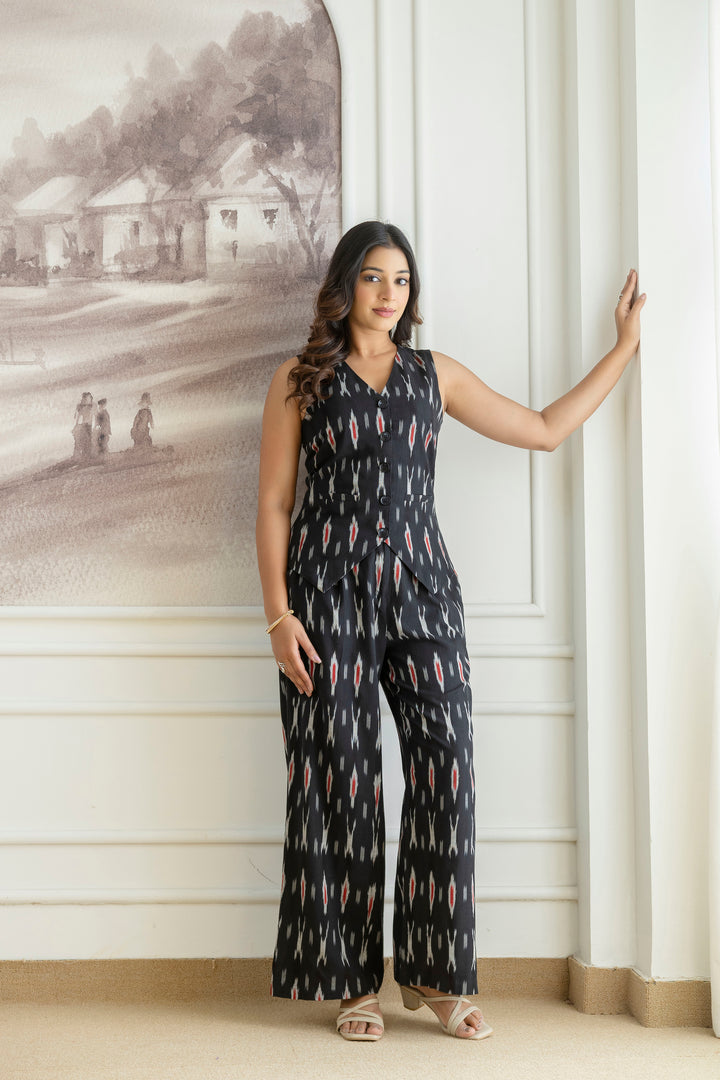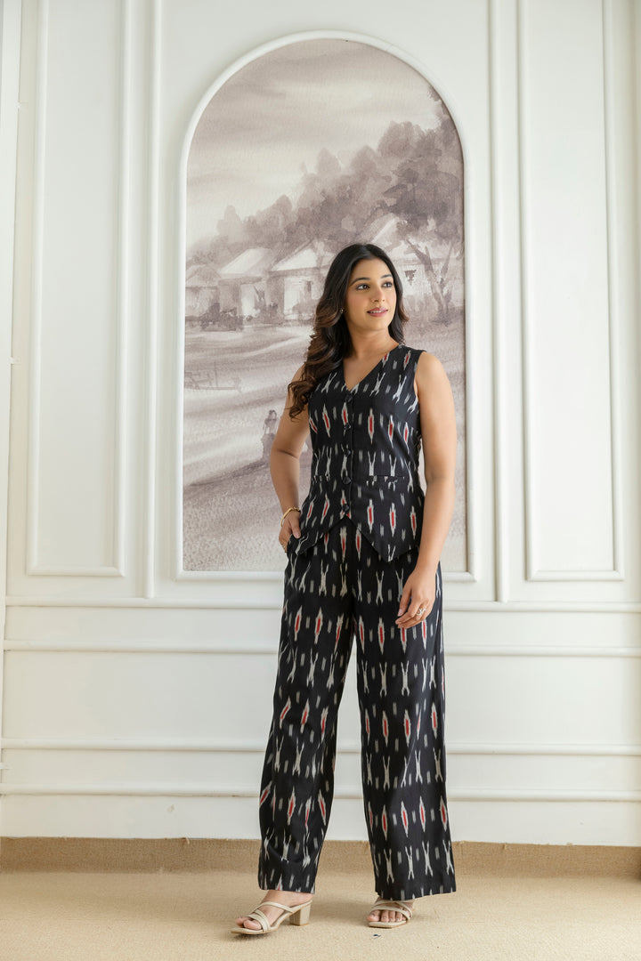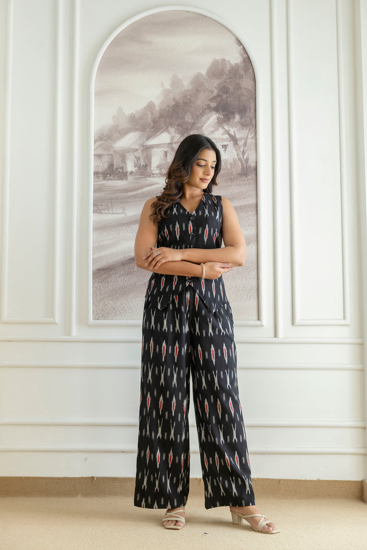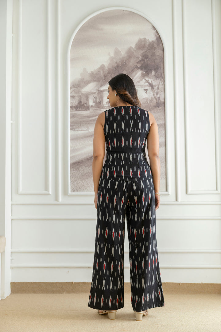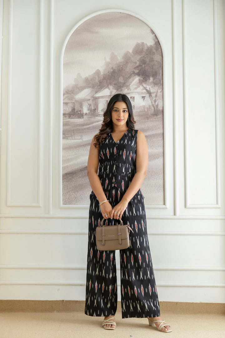 Elevate your wardrobe with this chic black co-ords set, crafted from comfortable ikat fabric. The sleeveless top pairs seamlessly with the wide-leg pants, offering a stylish and comfortable look.