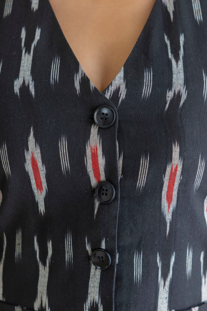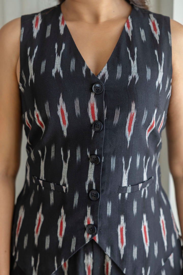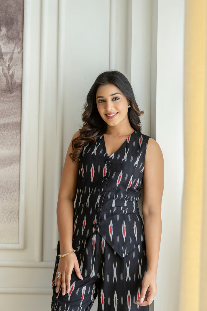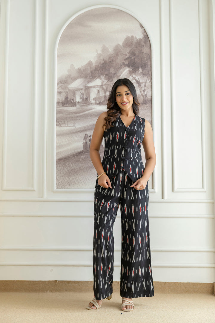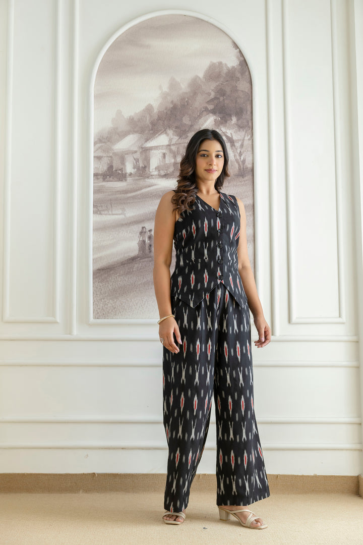 Elevate your wardrobe with this chic black co-ords set, crafted from comfortable ikat fabric. The sleeveless top pairs seamlessly with the wide-leg pants, offering a stylish and comfortable look.