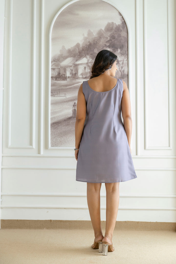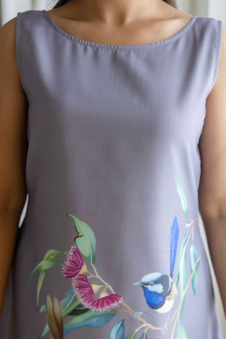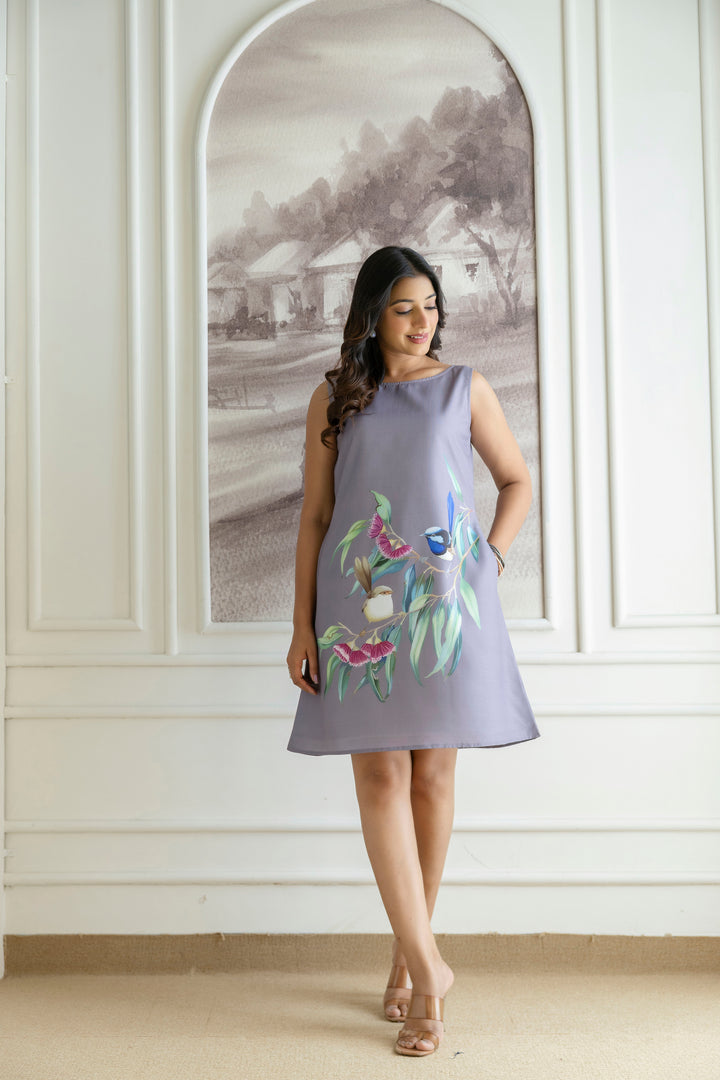 Stunning grey floral dress, perfect for any occasion. With a sleeveless design and beautiful floral pattern featuring pink flowers and a blue bird, this dress is sure to turn heads. Pair it with heels and statement accessories for a chic look.
