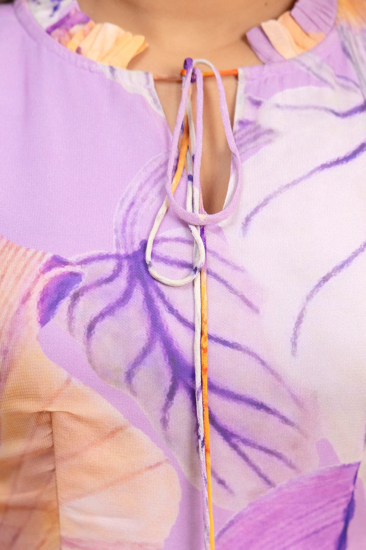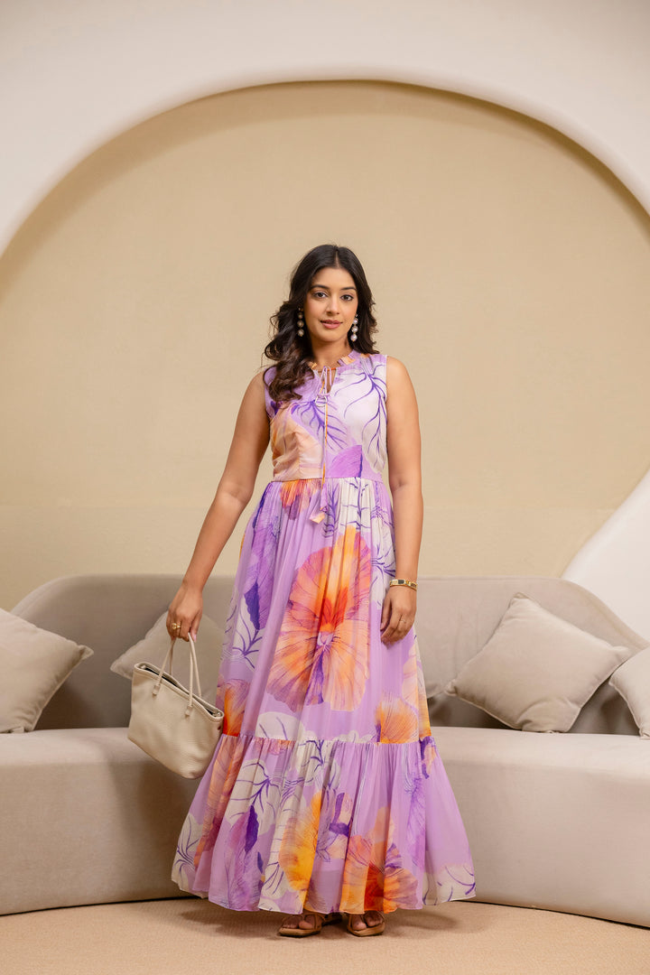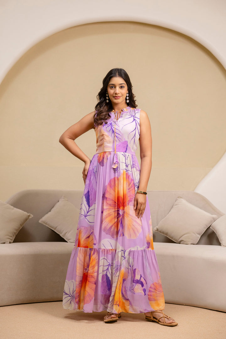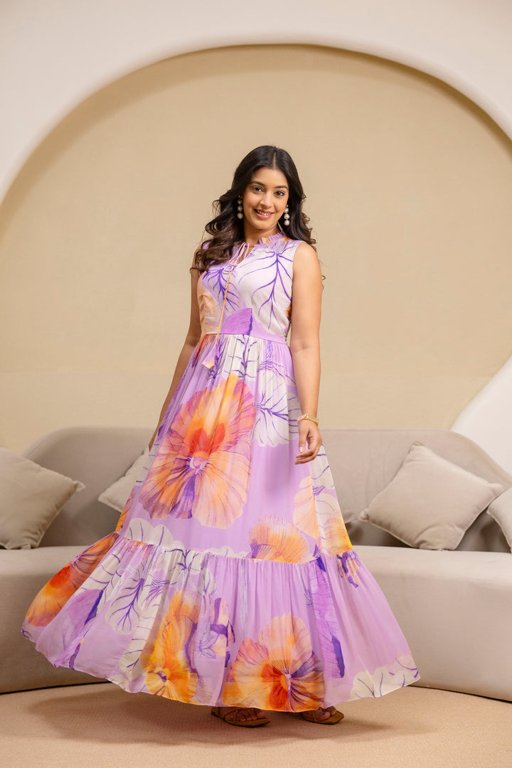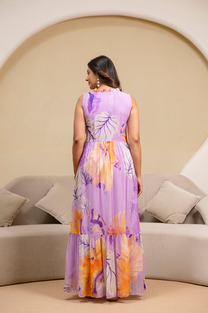 Elevate your style with this stunning lavender floral maxi dress adorned with vibrant floral prints in shades of orange, yellow, and purple. Crafted with a sleeveless design and a button-down front, this dress features a flowy pleated skirt with a ruffled hem. Pair it with strappy sandals for a chic, effortless look perfect for any occasion.