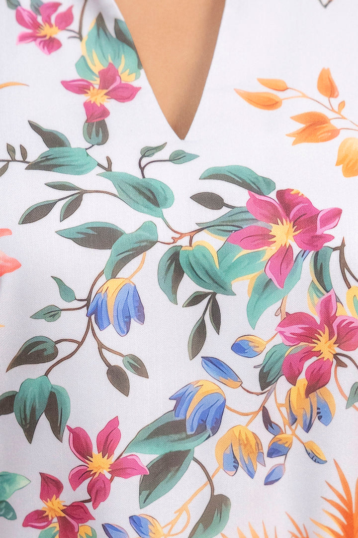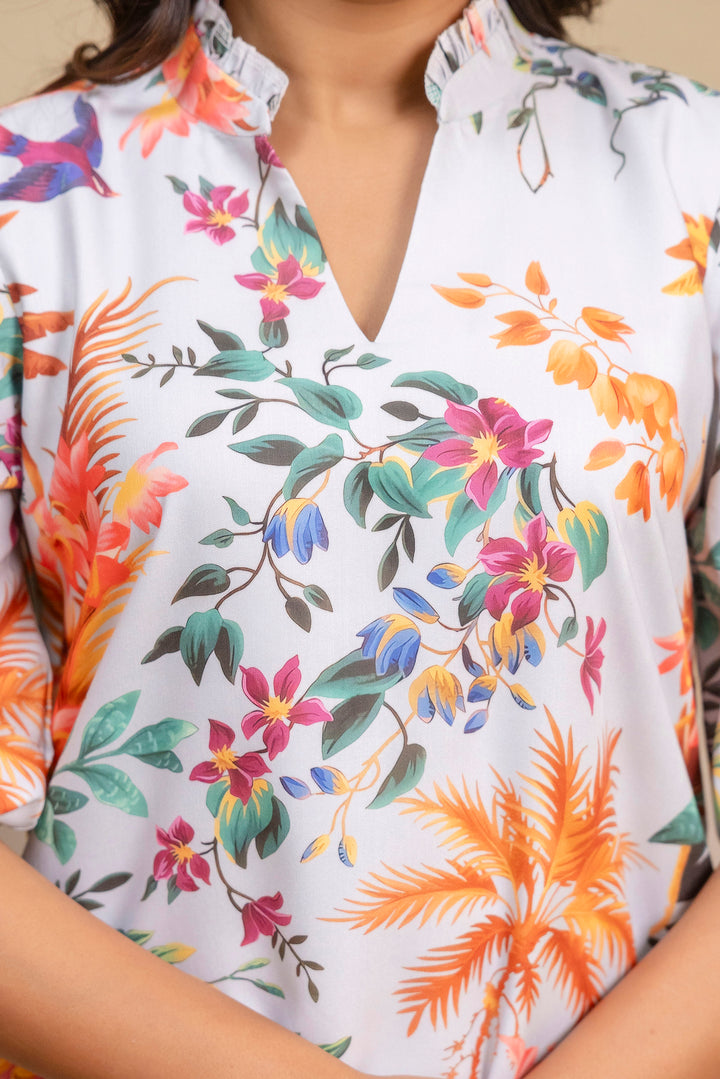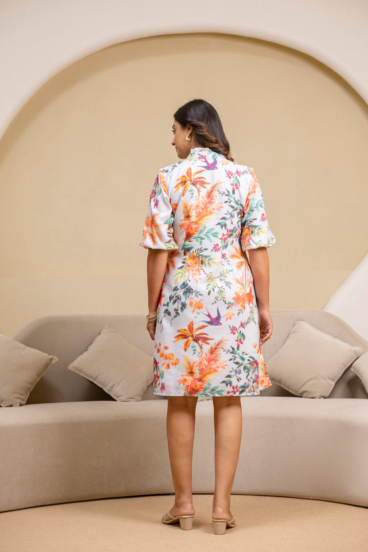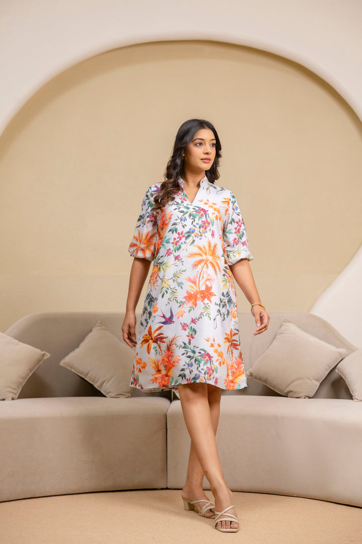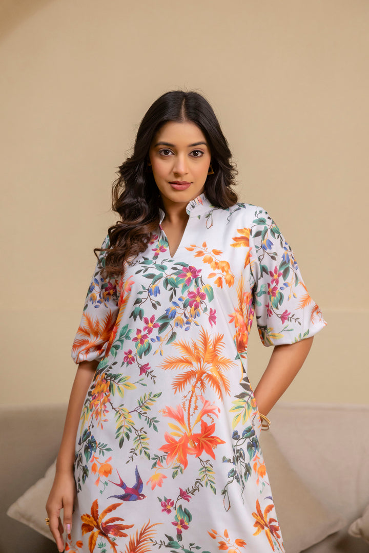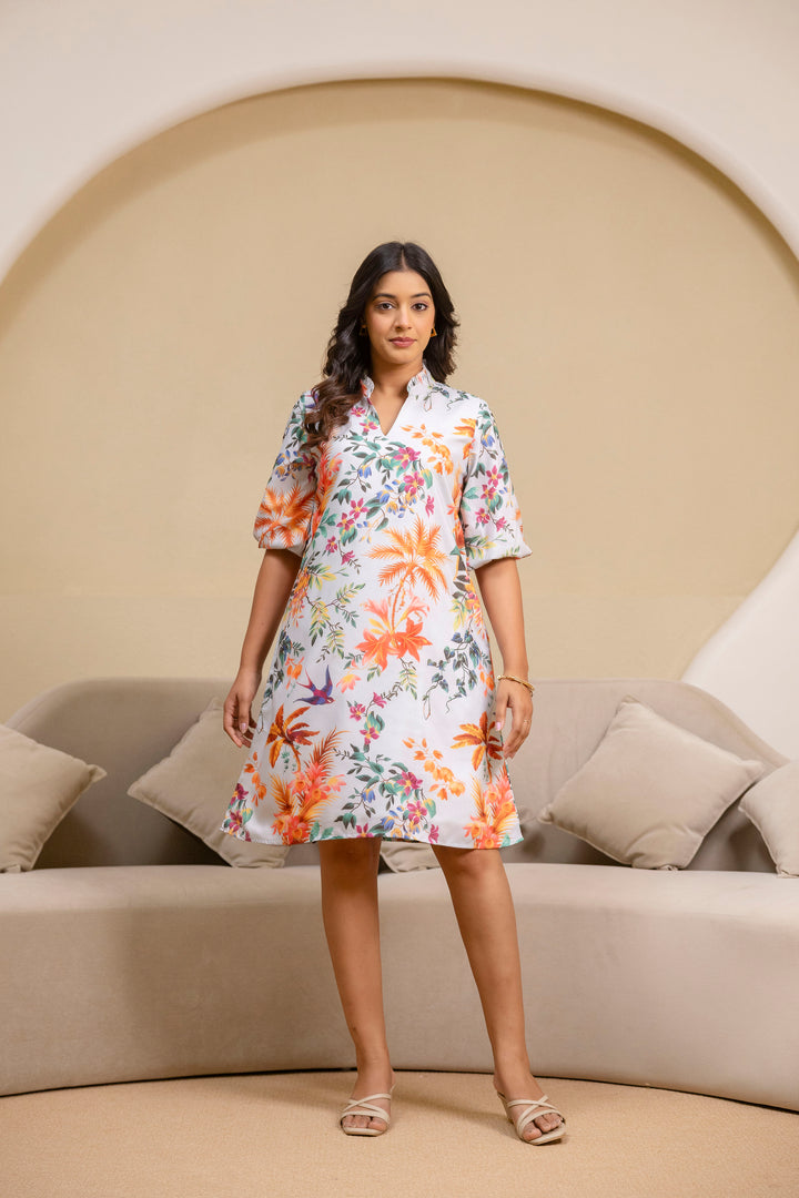 Effortlessly elegant, this pastel blue A-line dress blooms with vibrant tropical florals in shades of orange, green, and pink. Crafted from lightweight fabric with a flattering V-neck and puff sleeves, it’s perfect for brunches, getaways, or casual soirées. Comfort meets charm in every detail.