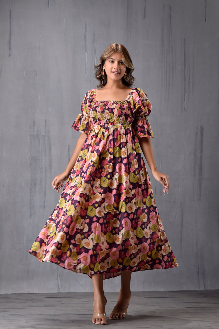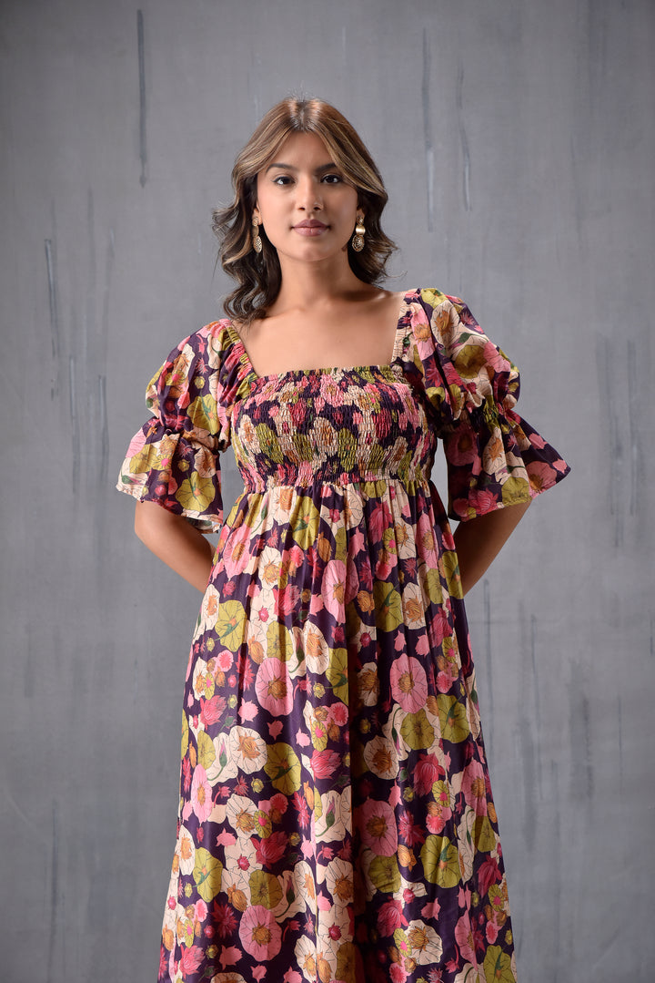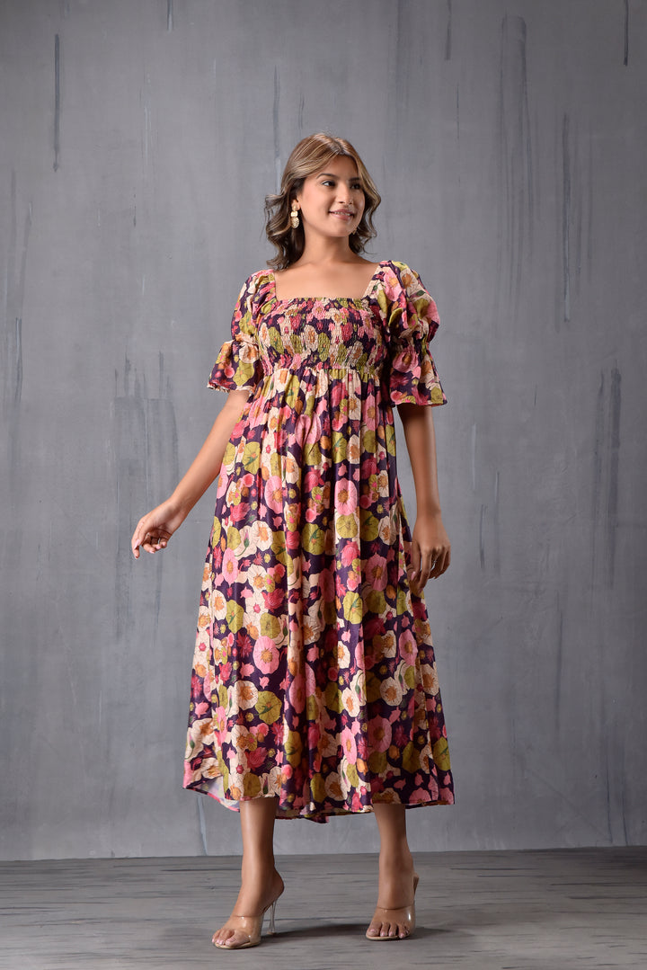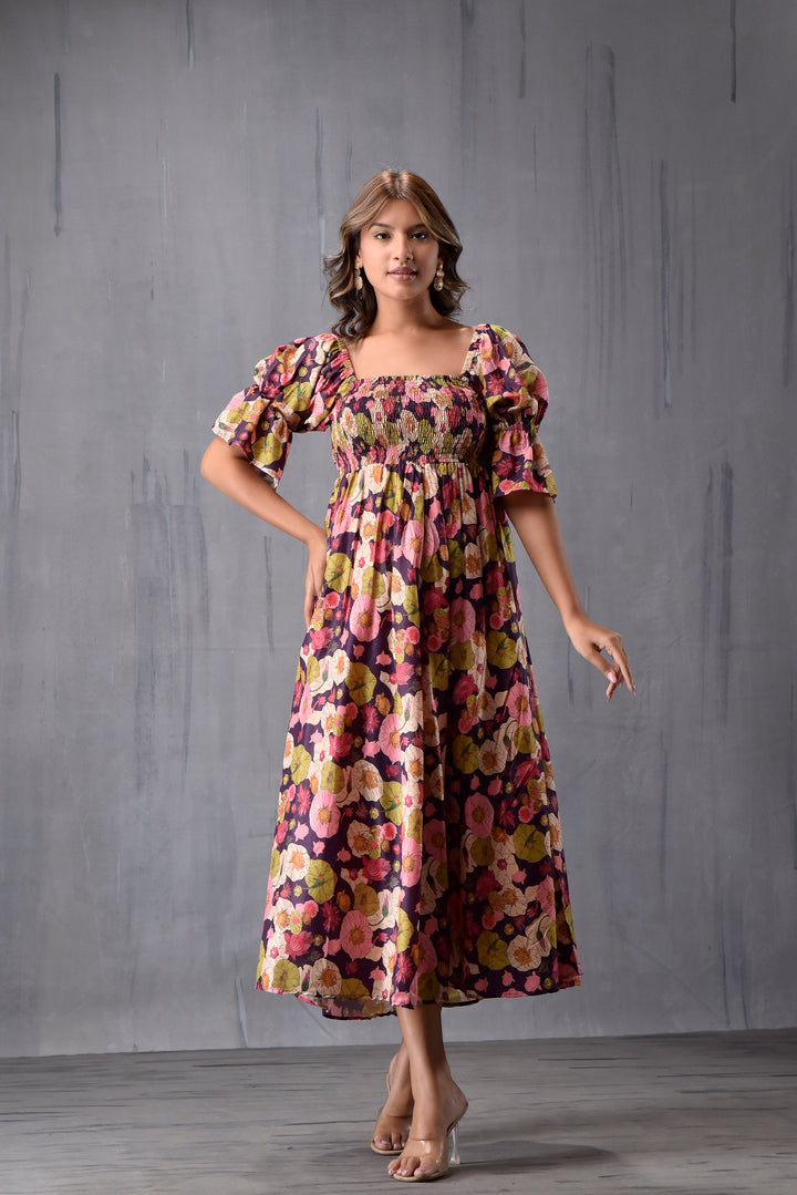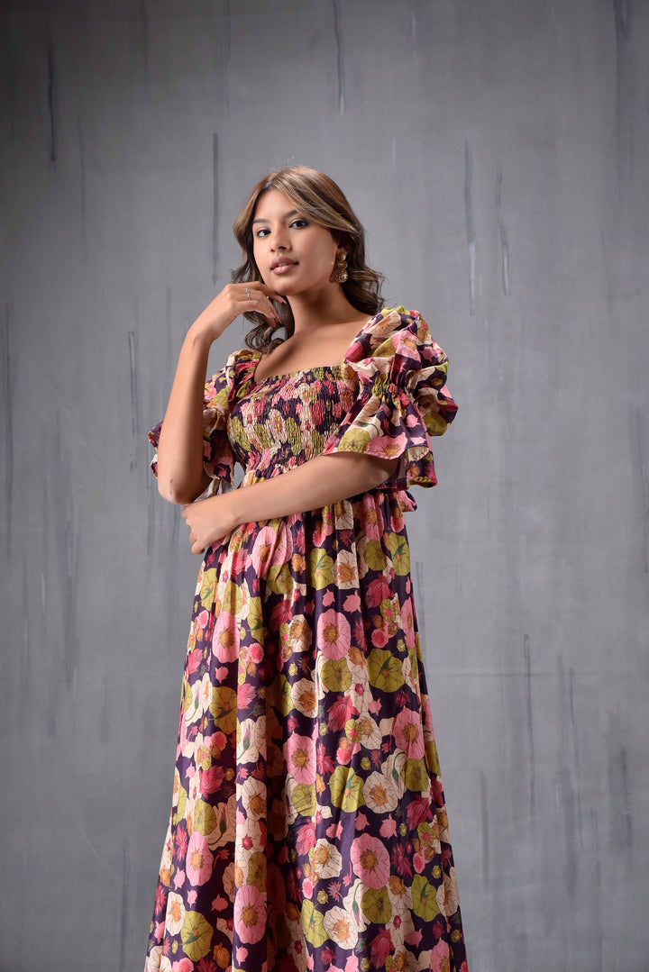 long, floral print dress with a bohemian vibe. The dress has a square neckline with smocking at the bodice, creating a fitted look at the top while the rest of the dress flows loosely down to the ankles. The sleeves are puffed and short, adding a vintage, romantic touch to the outfit. The floral pattern consists of vibrant hues, including pink, yellow, and green, set against a dark background, giving the dress a lively and feminine feel. The lightweight fabric and relaxed fit make it ideal for casual outings or warm weather.