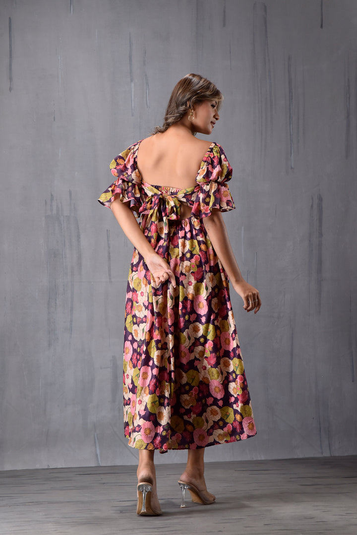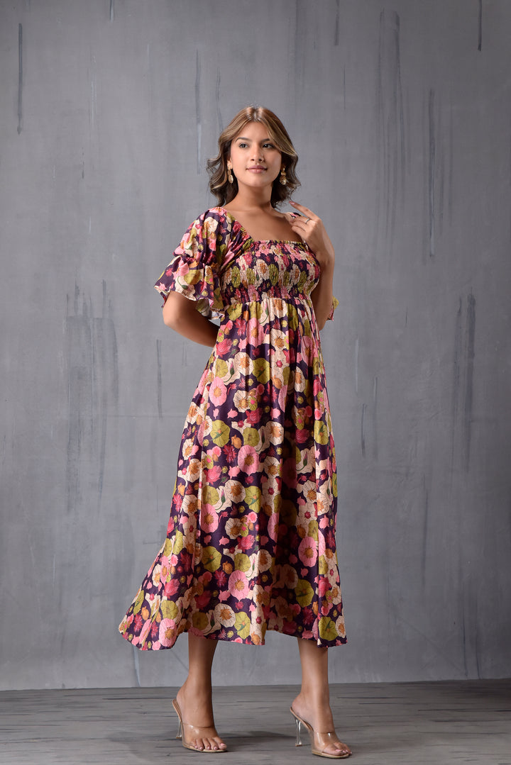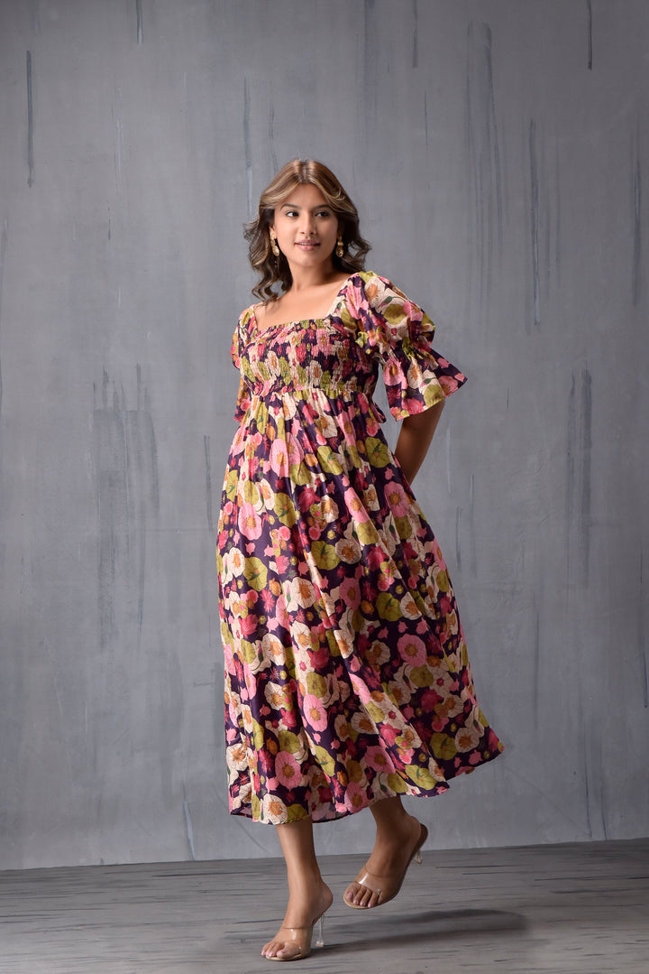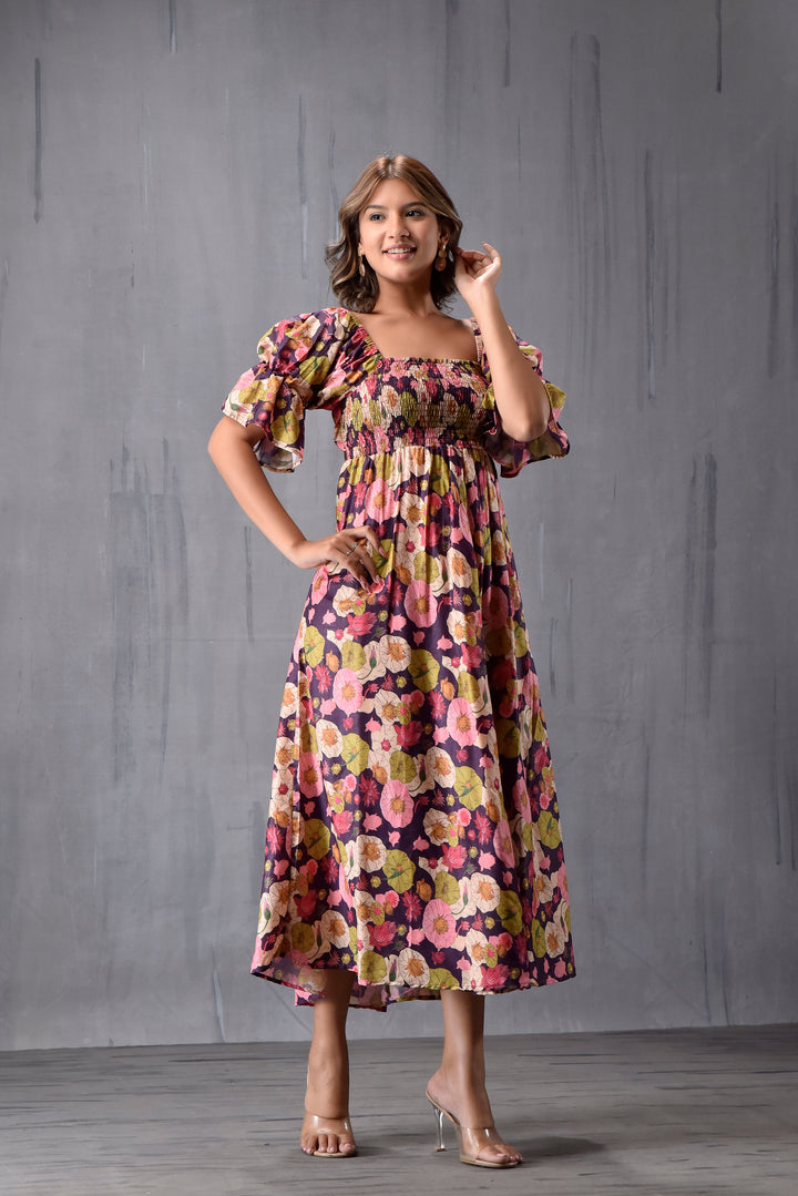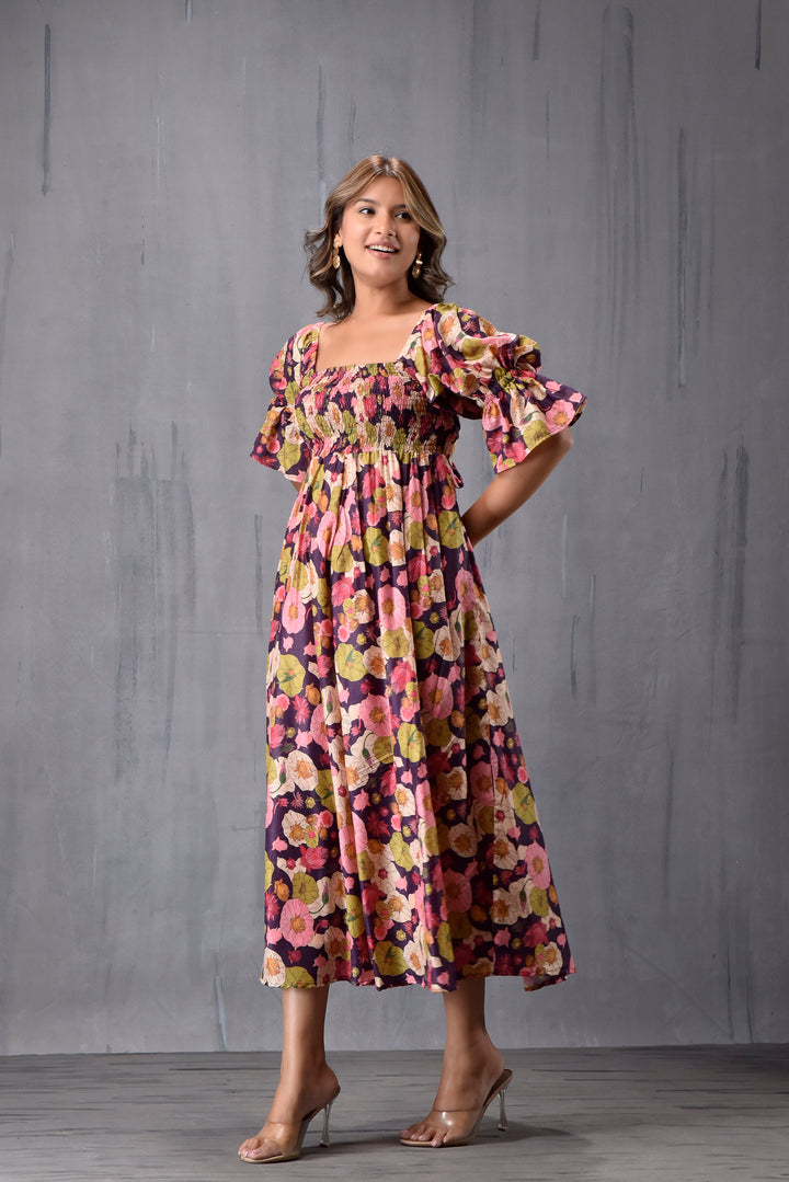 long, floral print dress with a bohemian vibe. The dress has a square neckline with smocking at the bodice, creating a fitted look at the top while the rest of the dress flows loosely down to the ankles. The sleeves are puffed and short, adding a vintage, romantic touch to the outfit. The floral pattern consists of vibrant hues, including pink, yellow, and green, set against a dark background, giving the dress a lively and feminine feel. The lightweight fabric and relaxed fit make it ideal for casual outings or warm weather.